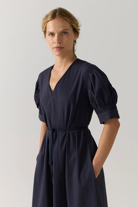 Sold outThe Demi Dress in Navy Stripe Poplin