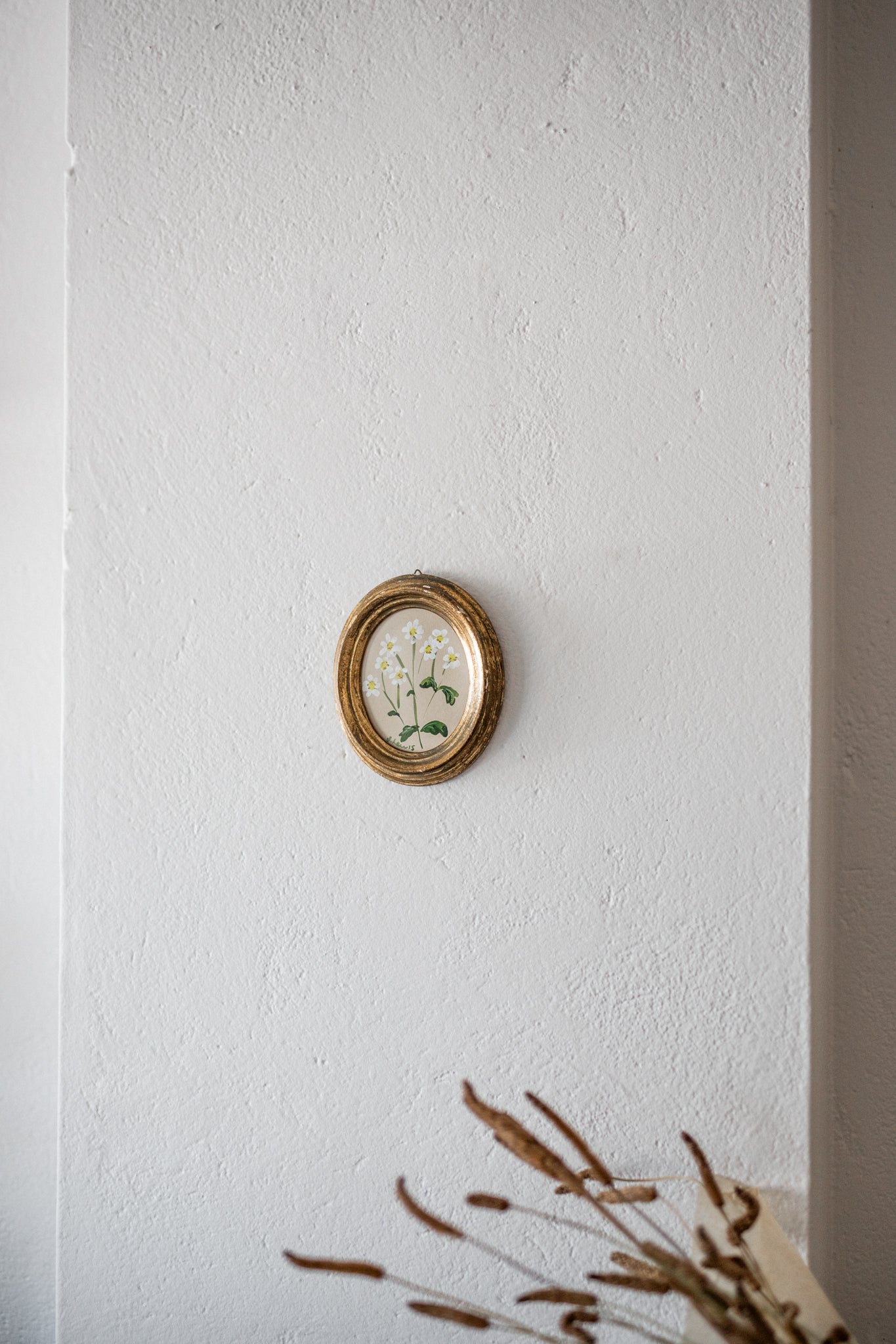 Each Floral Study painted in gouache and ink by UK artist, Sarah Lewis, has been framed under glass in a gorgeous vintage French oval frame.