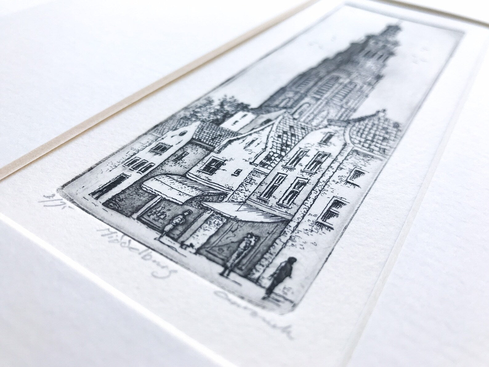 Signed and numbered. The etching itself measures 5 x 15 cm with a mount that’s the same color as the paper. Frame measures 22 x 32 cm