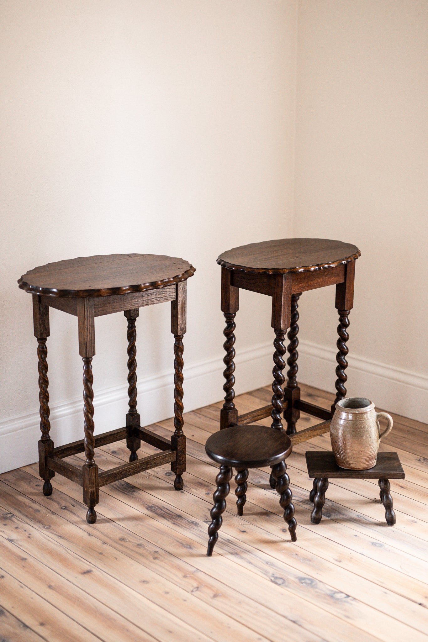 Solid dark oak timber and sturdy, lovely authentic construction with beautiful, barley twist legs.