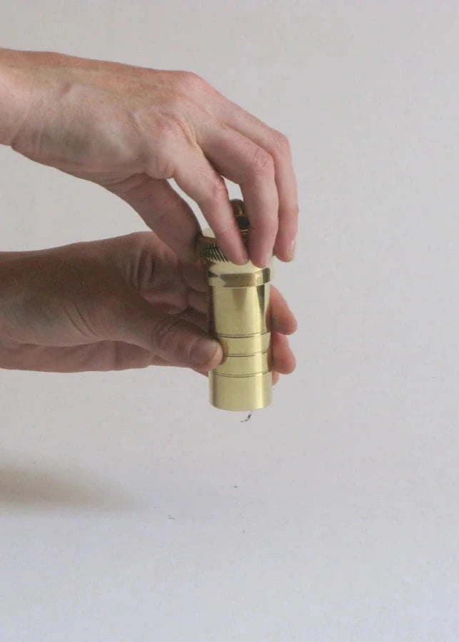 - Manual operated brass pepper mill with rotating top and open bottom.