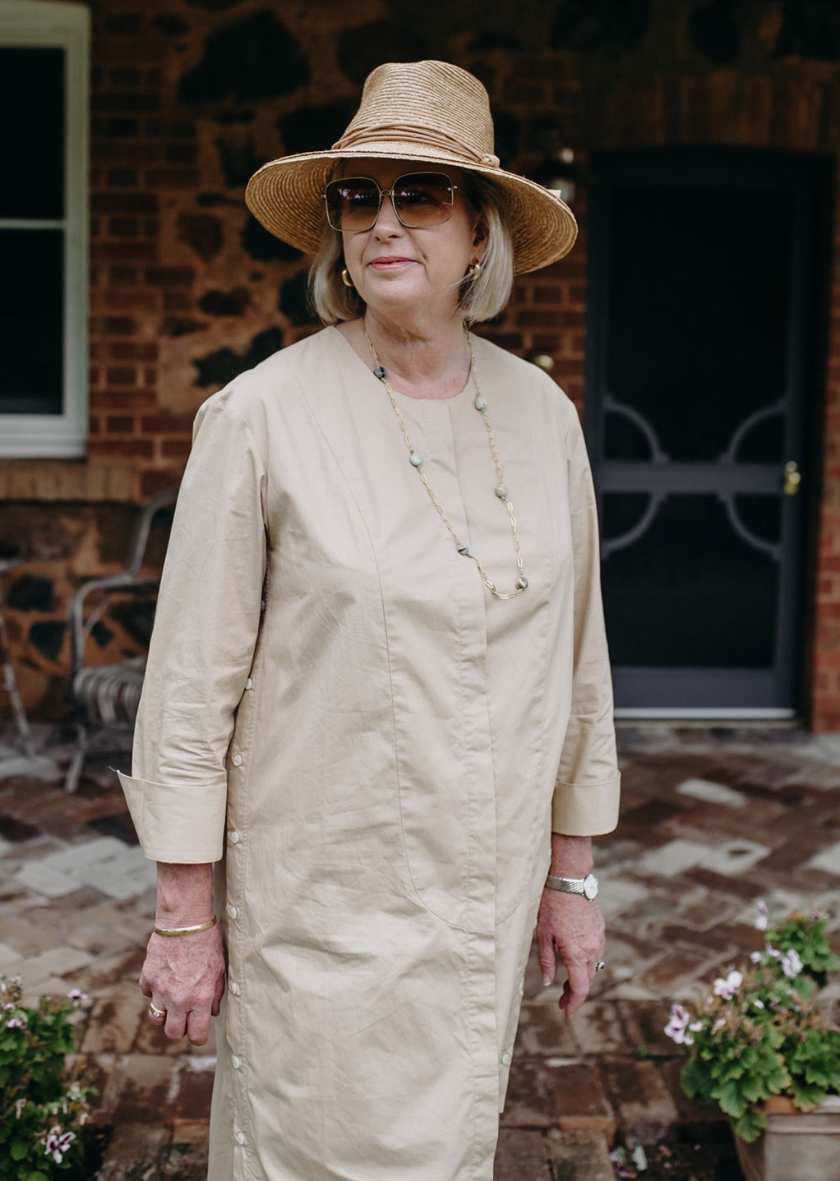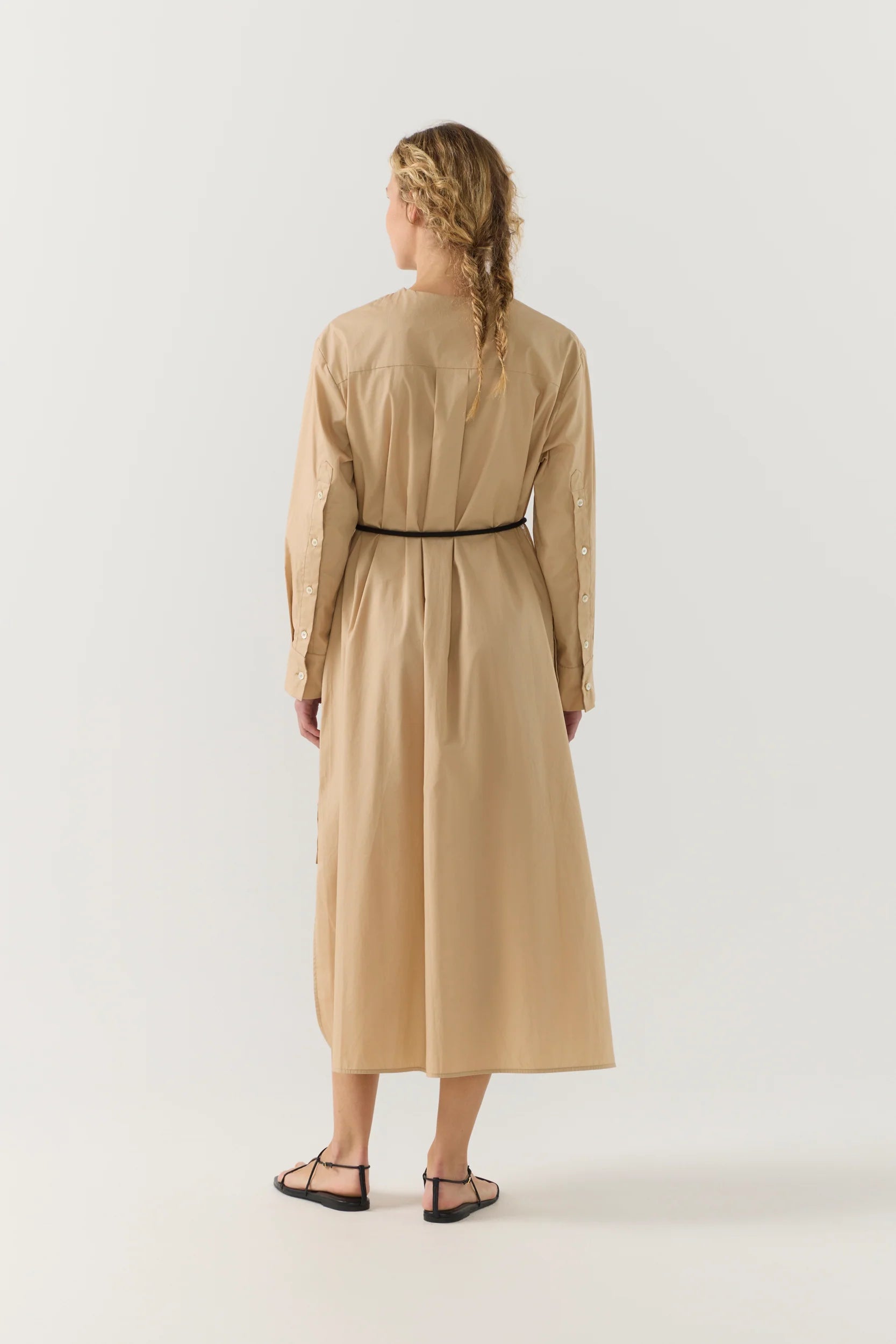A contemporary take on utilitarian dressing, the Celine Dress features clean lines and considered detailing. The minimalist silhouette is grounded by a deep round bib with a concealed placket, while a gently curved high-low hem and side splits with functioning plackets allow for ease and versatility. Cut from crisp cotton poplin, the long sleeves are finished with extended plackets for adjustable styling. Designed to be worn with or without the optional belt, this style moves effortlessly between refined and relaxed