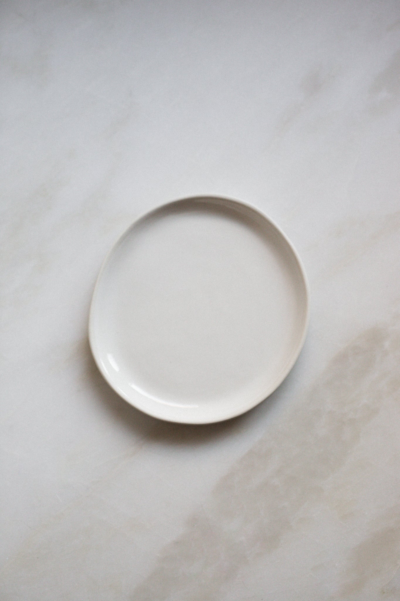 A gorgeous handmade bread plate, made from white porcelain clay and hand-brushed with a white gloss glaze.