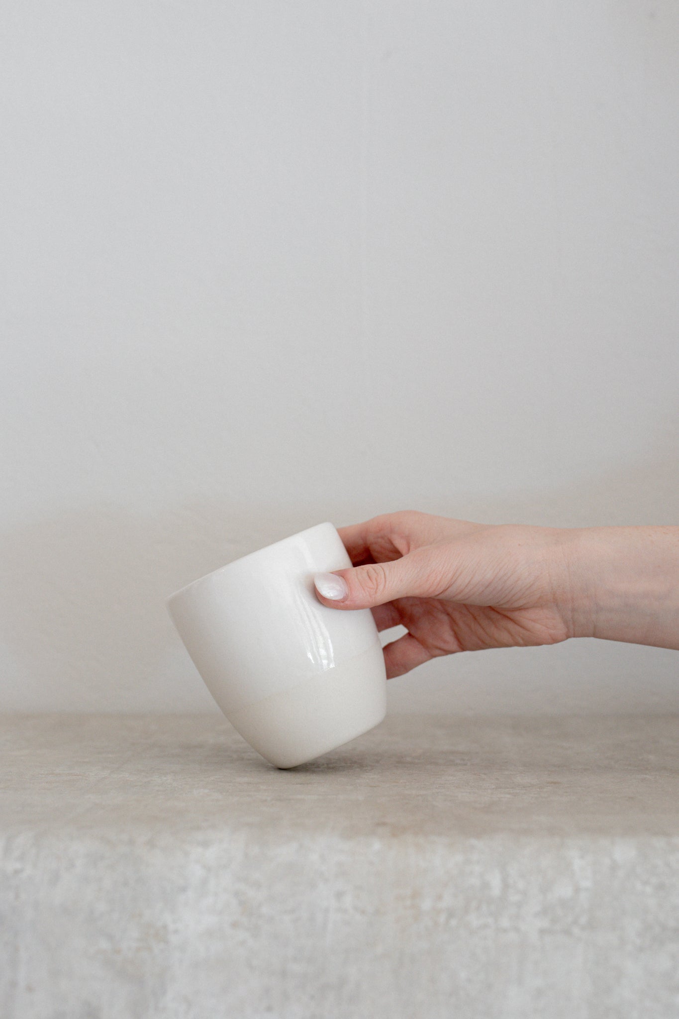 Handmade ceramic coffee cup, made from creamy white Australian porcelain clay and hand-dipped in our white gloss glaze for a beautiful subtle contrast. Great for all coffee types, including tea and iced coffee.