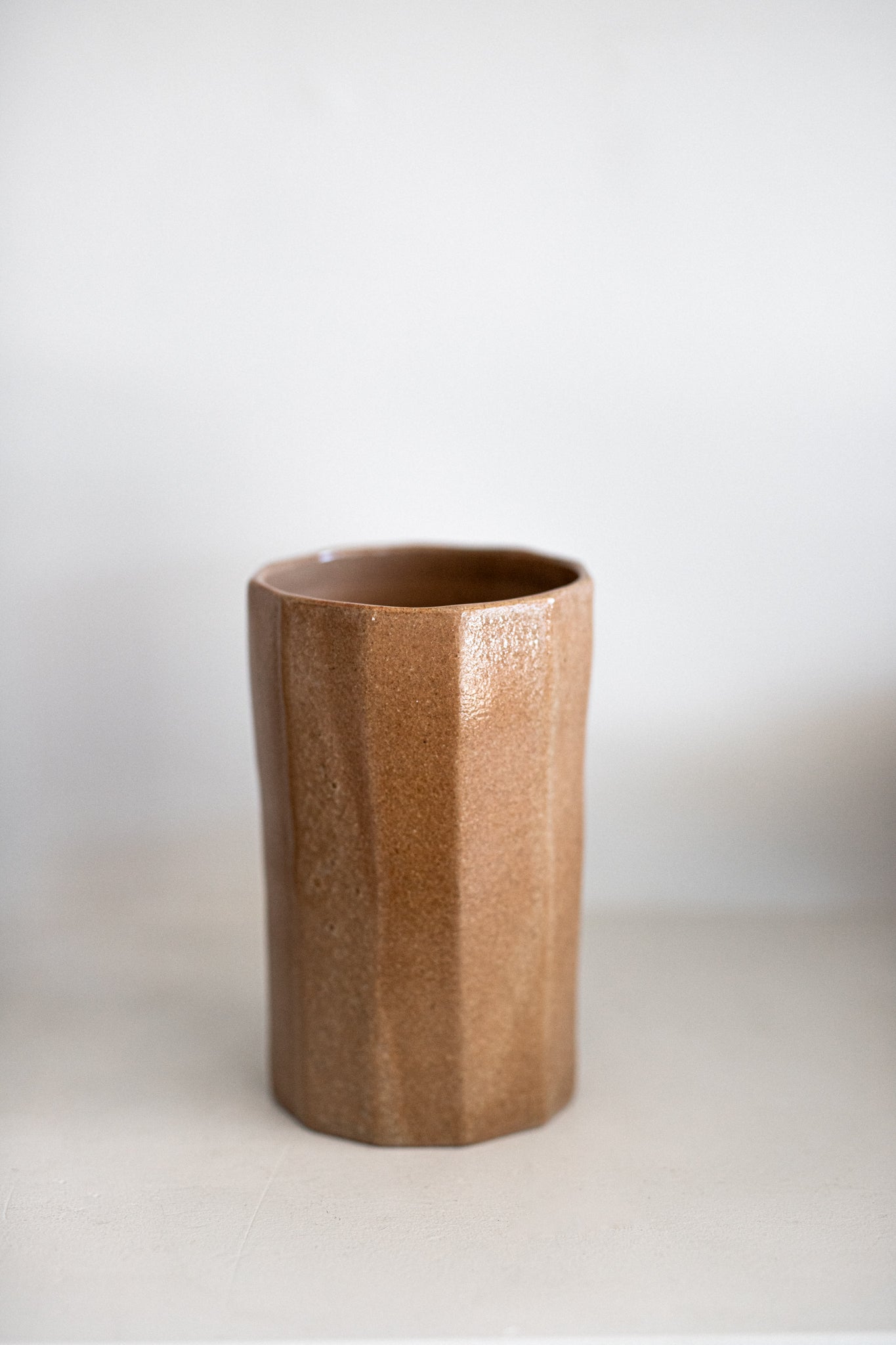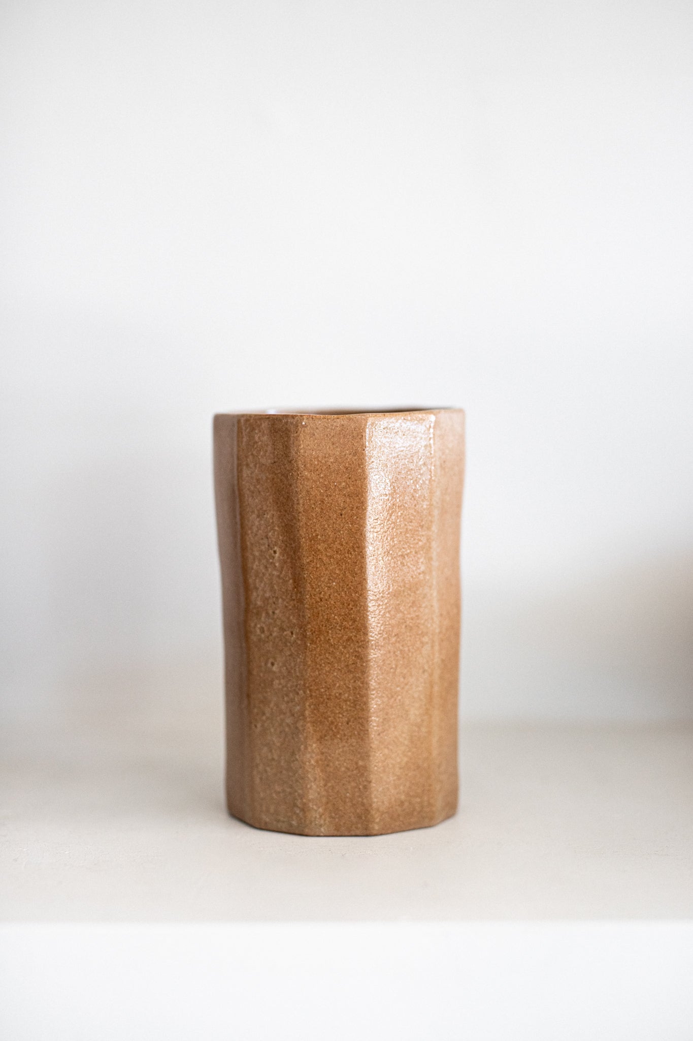 A simple, faceted, cylindrical vase finished in an apricot shino glaze. Fired twice for vitrification in a reduction atmosphere. Due to the nature of the craft no two vases are the same.