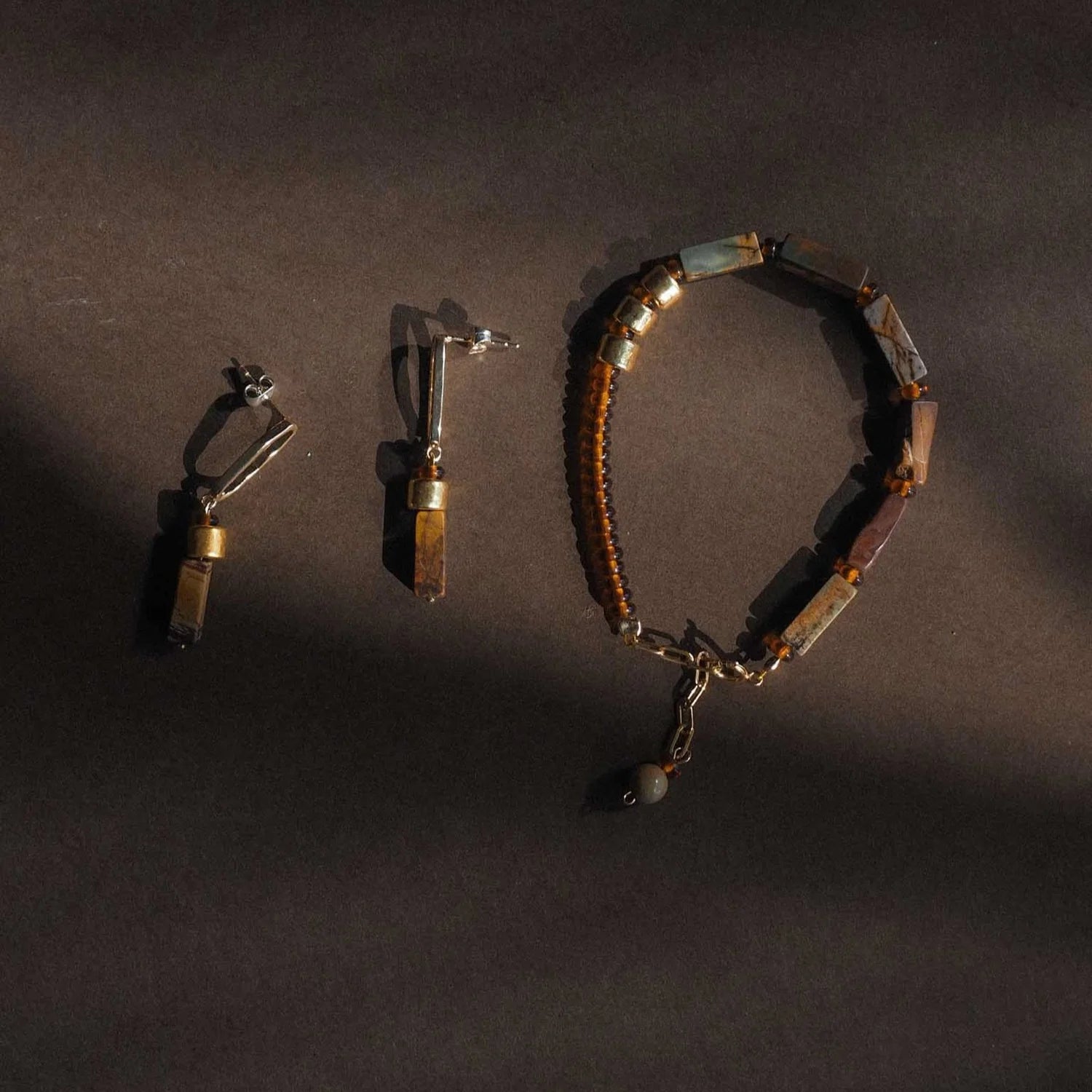 A beautiful, lightweight earring. A pair of rectangular jasper beads hang from a gold-filled stud, paired with gold luster ceramic beads, making these earrings an elegant statement piece.