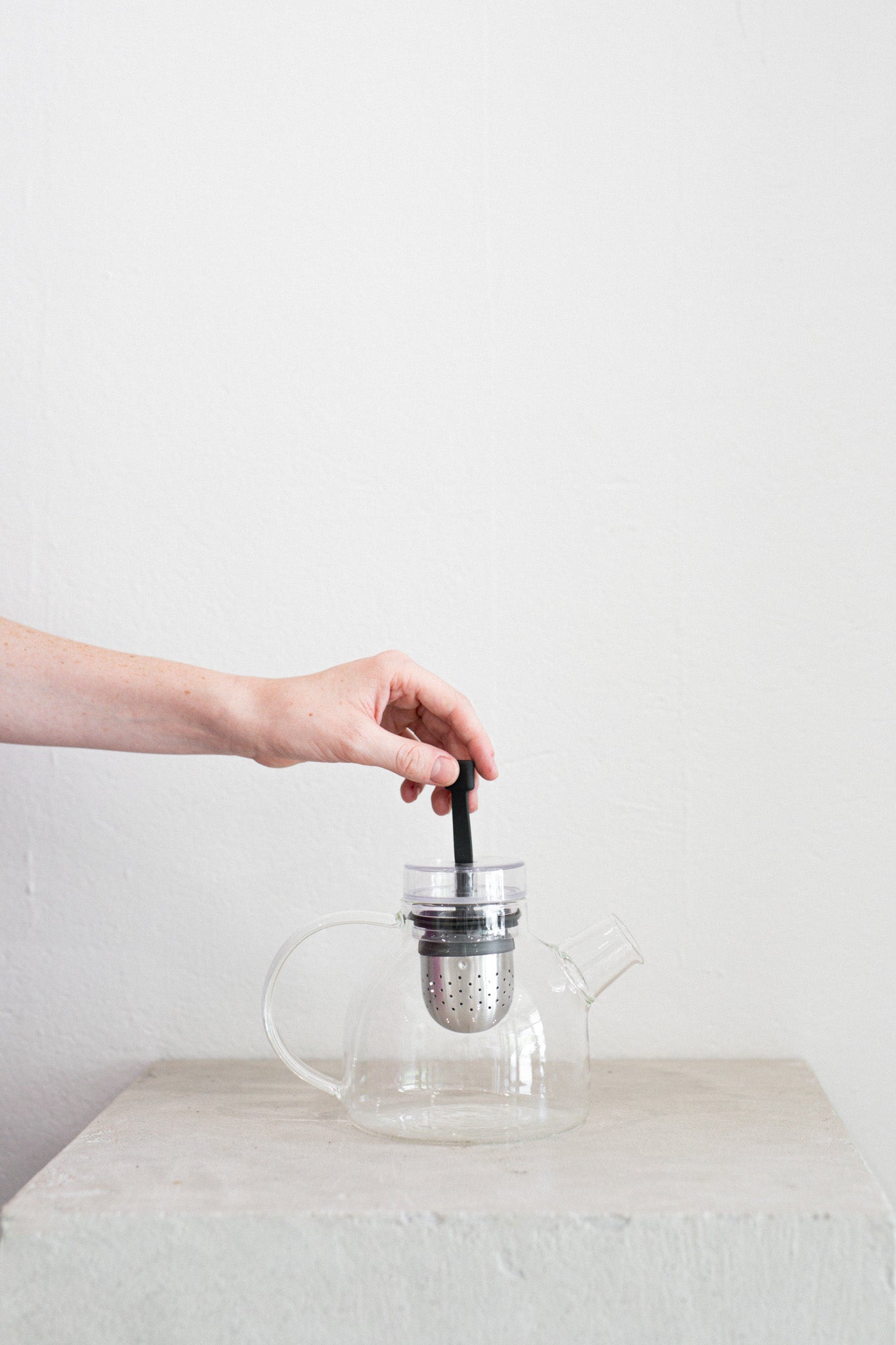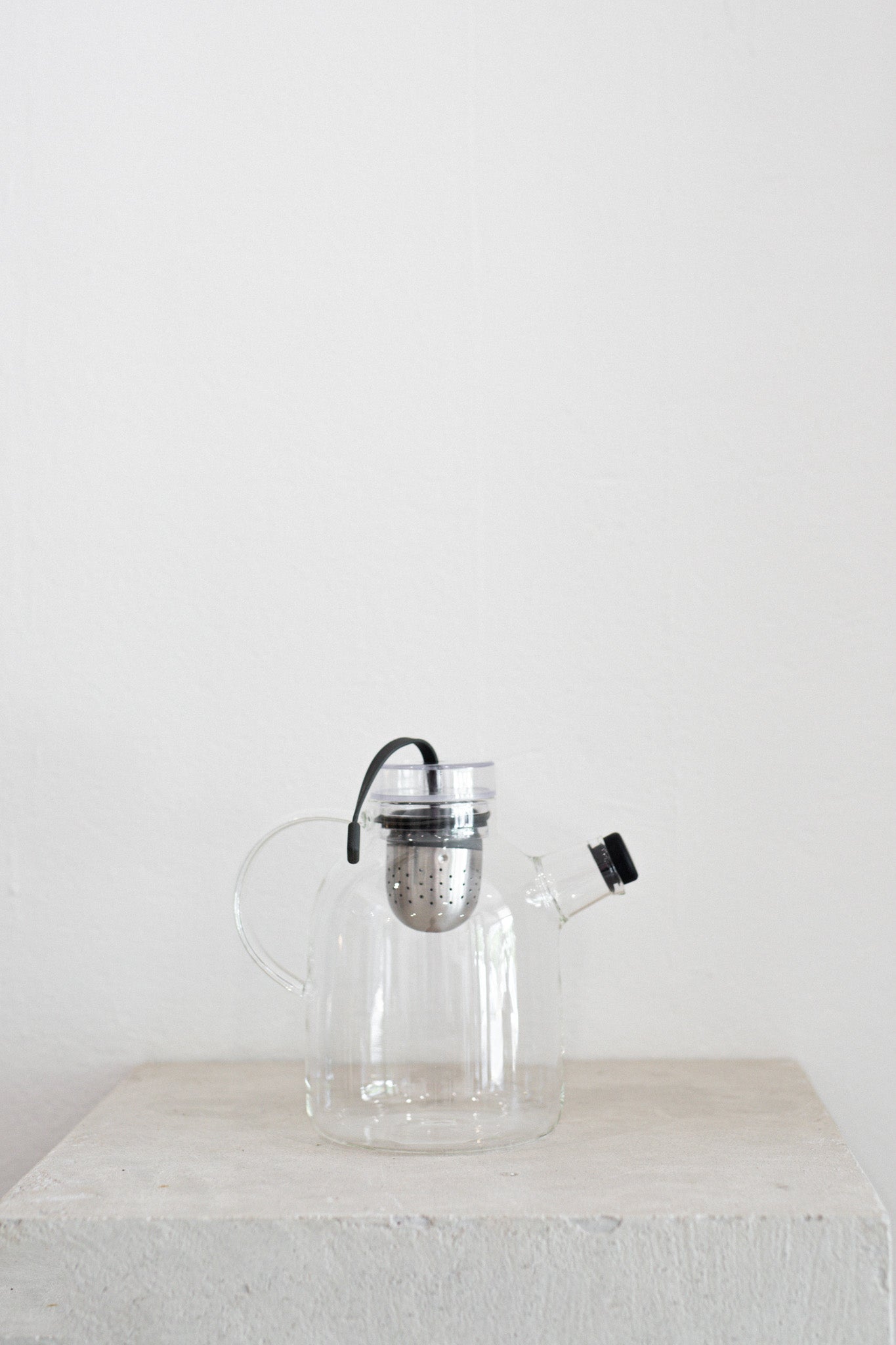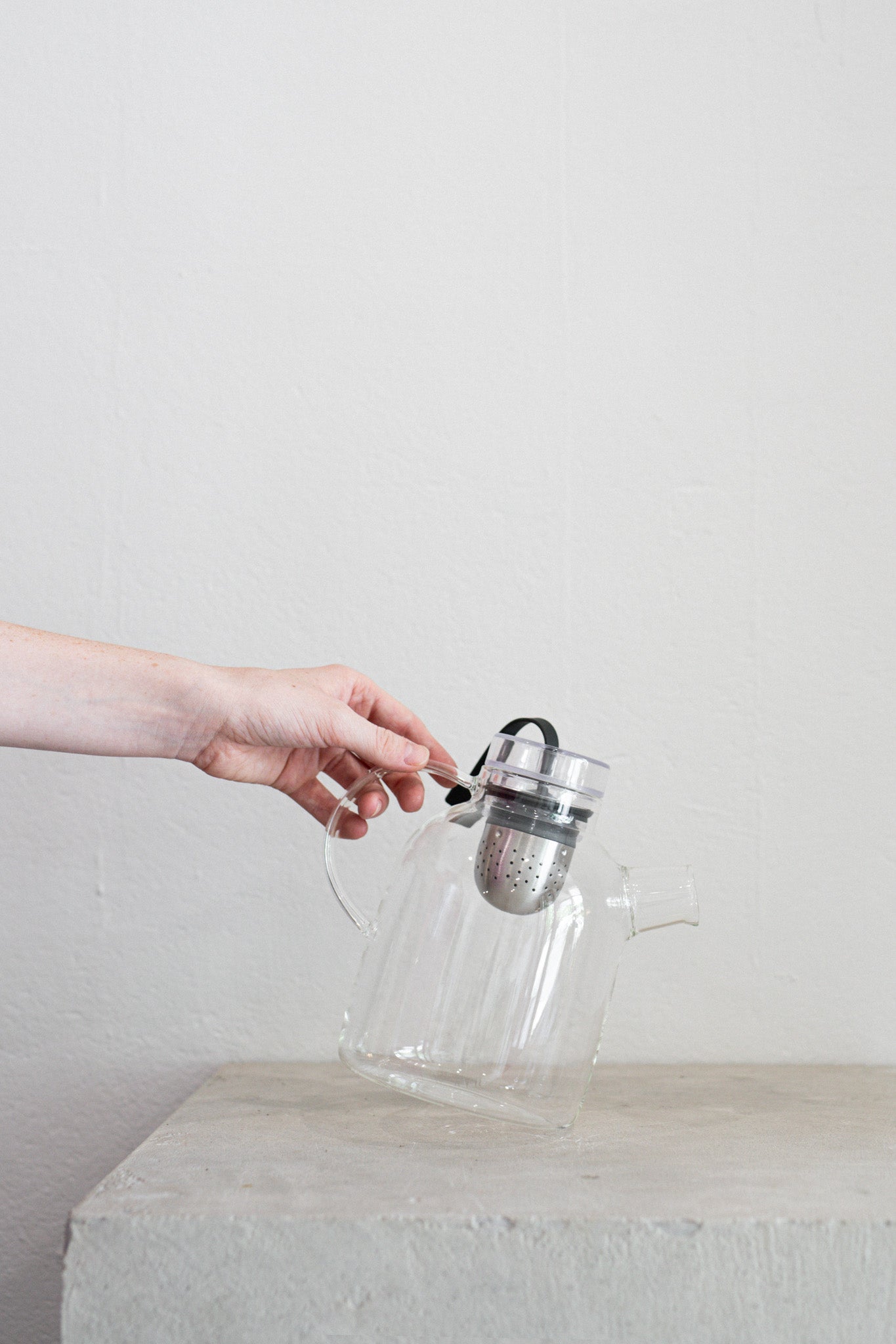 A lovely Glass teapot with tea infuser that hangs by a silicone string, serving as a stylish teabag in the middle of the teapot.