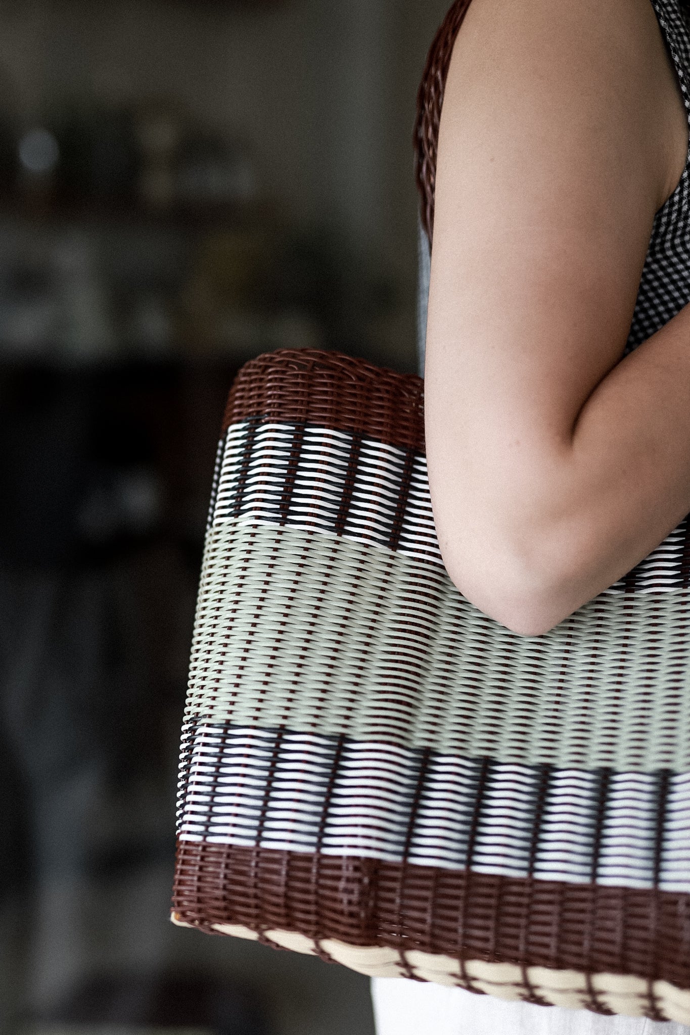 The Medium Basket is an iconic shoulder bag in an exclusive design, featuring a geometric weaving and a multistriped pattern, with a regular and repetitive rhythm.