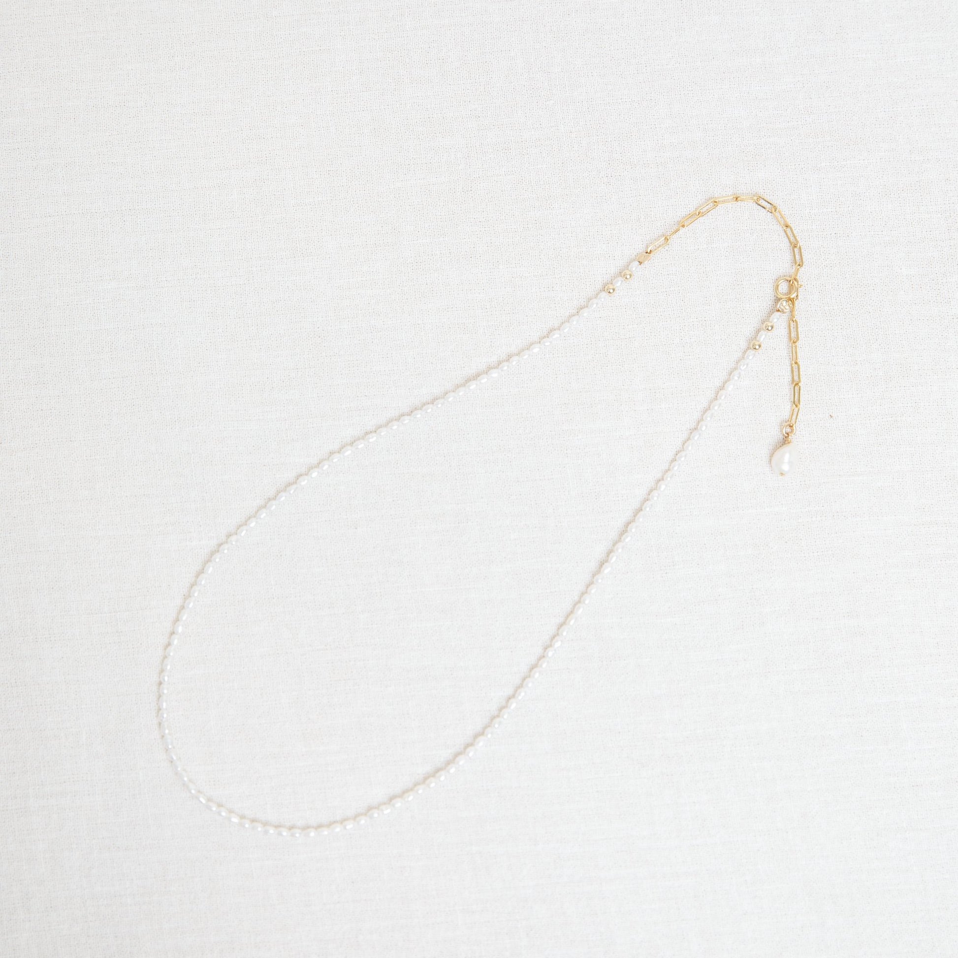 - Detailing tiny freshwater pearls of 1-2mm. With a larger pearl drop at the end of the chain of roughly 5mm.