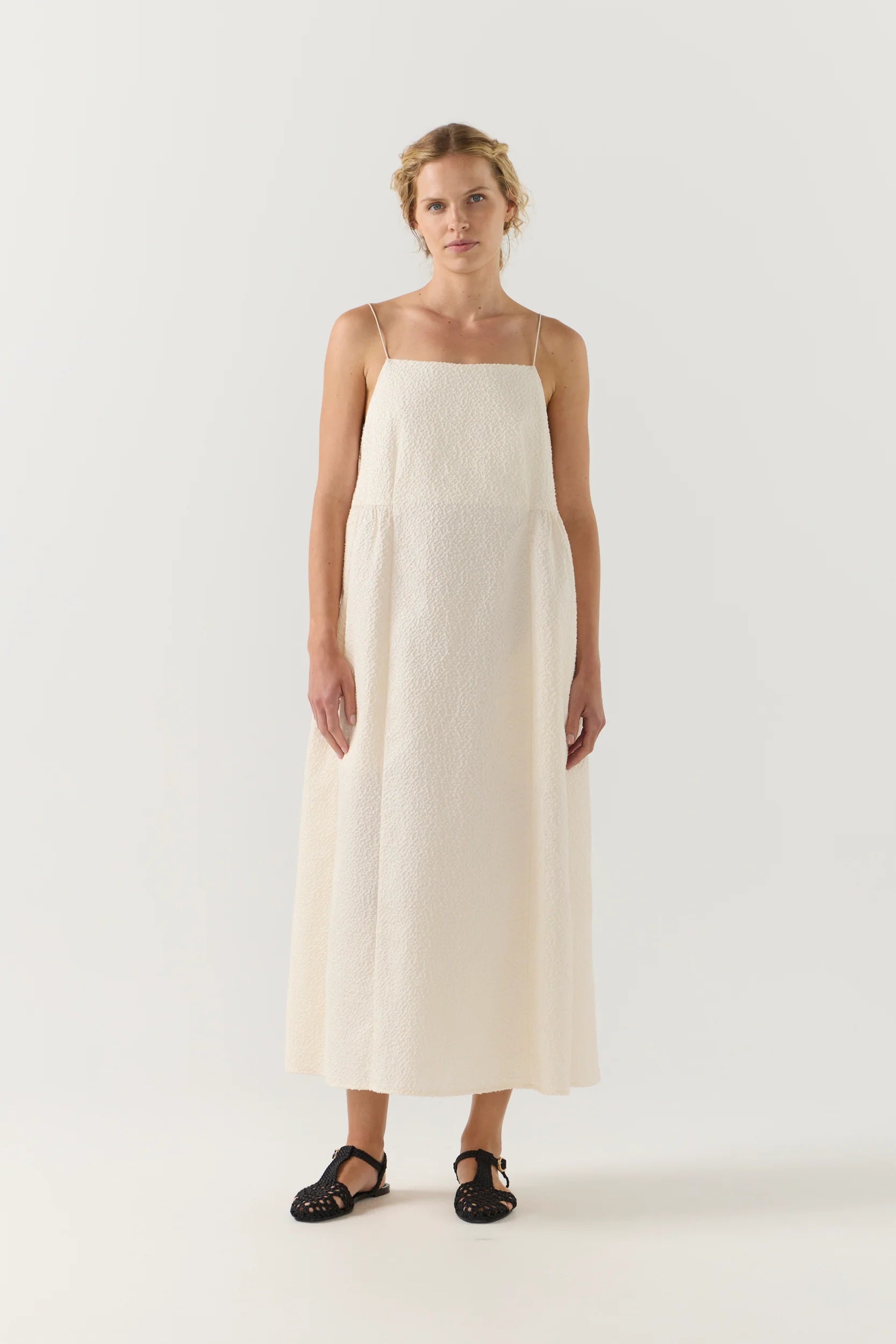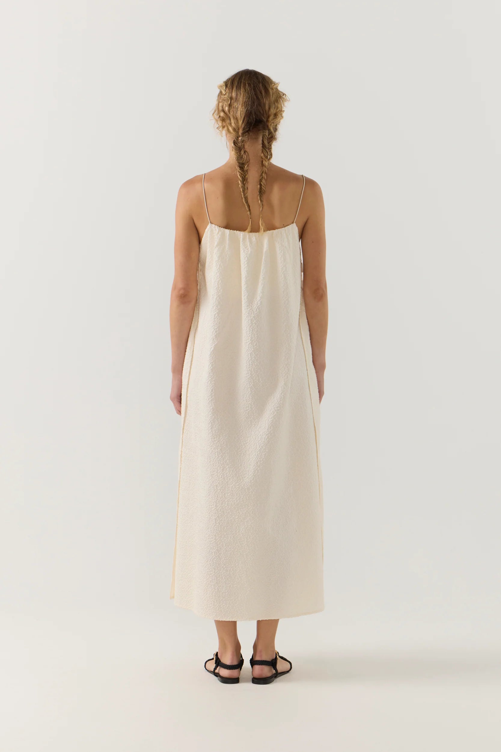 The Misty Dress evokes quiet sophistication through its minimalist lines and soft structure. Featuring a clean neckline and delicate elastic straps, it falls into a relaxed silhouette with subtle side gathers. Functional button detailing adds charm and ease, complemented by side seam pockets subtly concealed beneath the flap. A considered piece that invites movement and ease, designed for the modern wardrobe.