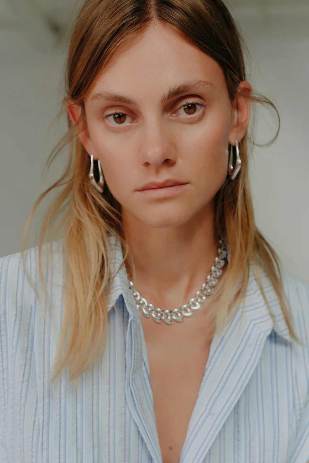 An elevated take on the shirt dress, this style is defined by its clean lines and subtle detailing. Cut to a midi length in a crisp blue pinstripe, it features a concealed placket for a streamlined finish. Pleats fall softly from the shoulder, opening into the skirt to create gentle volume and movement. A knotted rouleau belt cinches the waist, offering shape while maintaining an effortless feel.