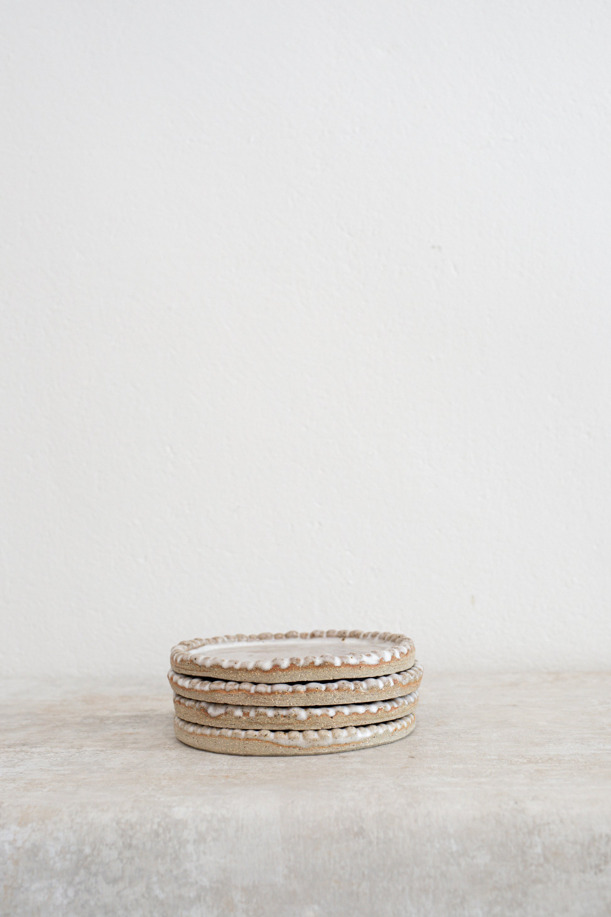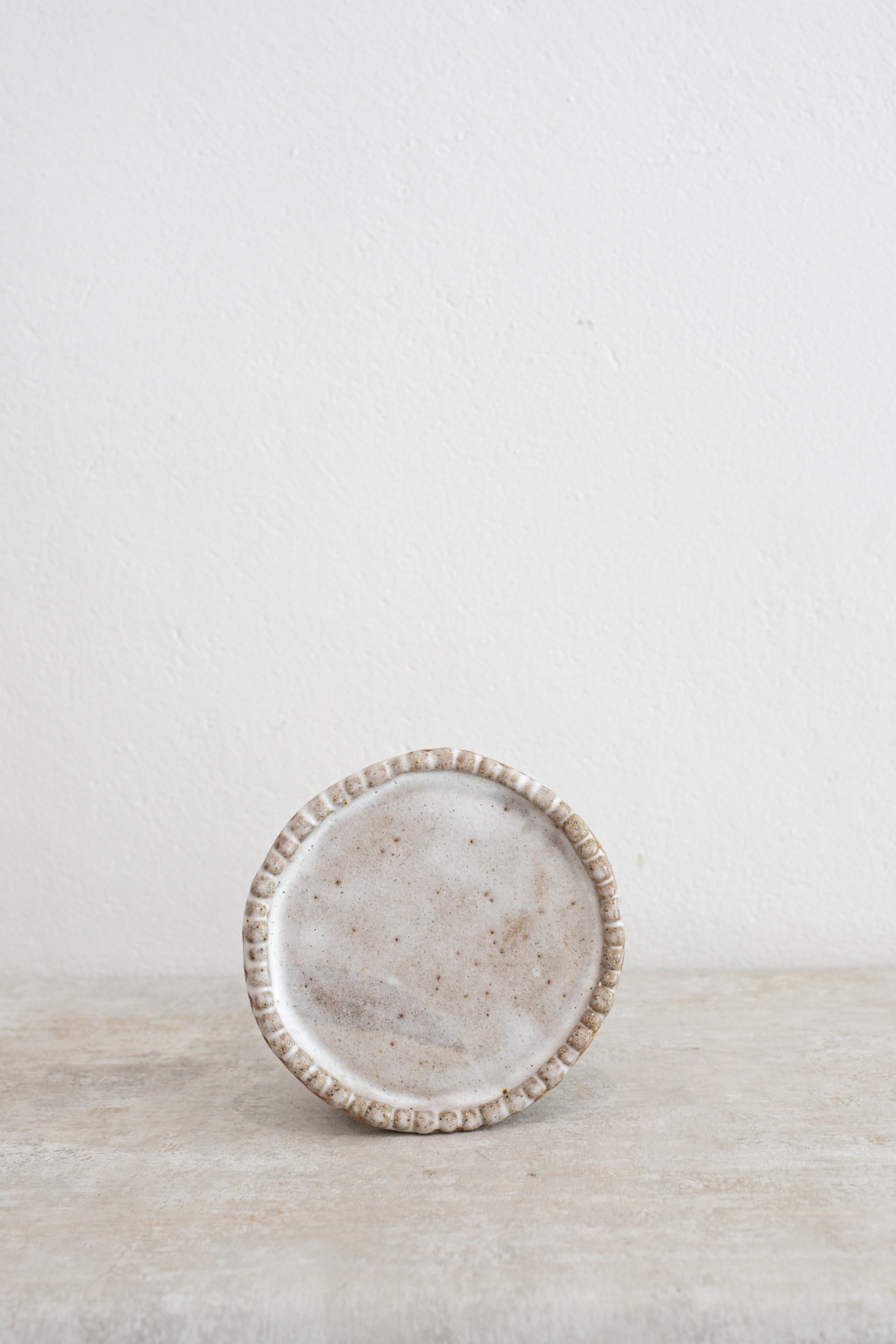 Detailing small ceramic pearls around the rim of the plate. Perfect as a side plate for a pastry, slice of cake, or perhaps to display your beautiful jewels, or displayed with a pillar candle. Glazed in a soft satin white. No two pieces will ever be exactly the same.