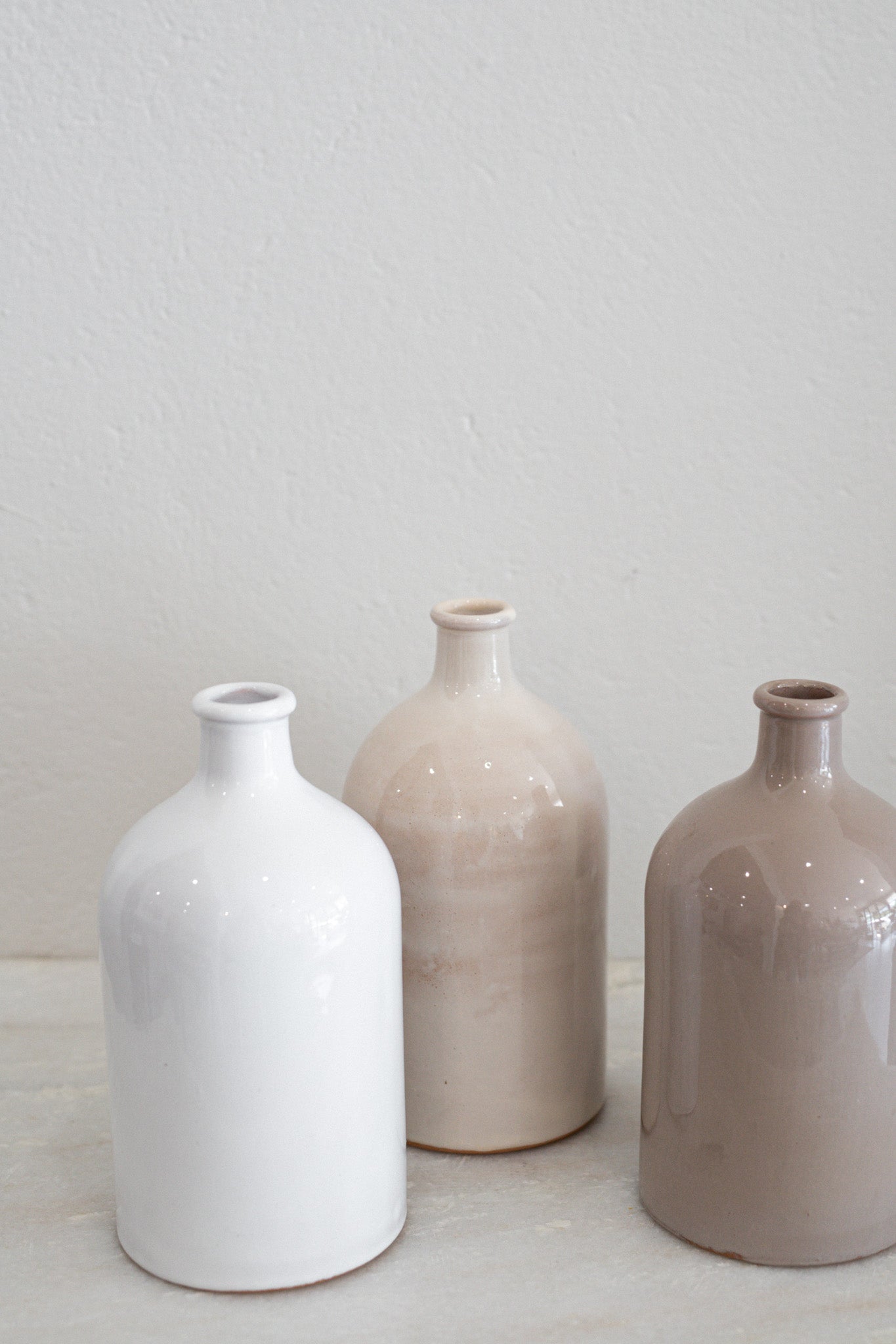 The bottles are fully glazed and can used for water, oil, wine, vinegar, or a sprig of dried flowers.