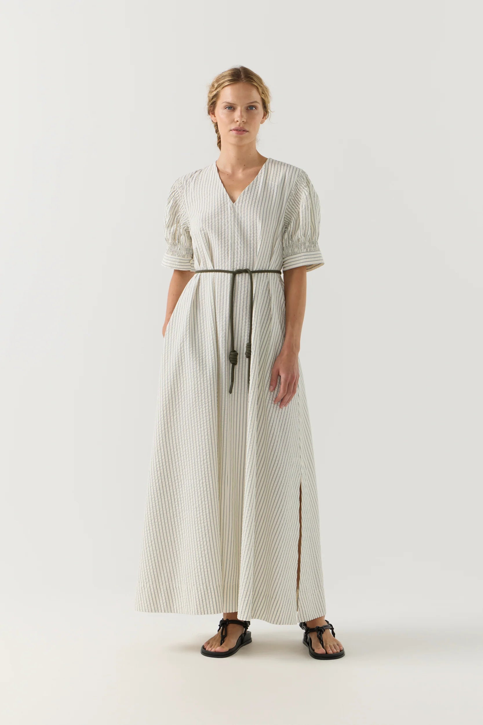 The Scottie Dress with its soft structure and romantic detail features a sculptural silhouette, gathered puff sleeves and a V neckline that opens into a generous A-line skirt. Subtle side splits add movement to the full-length skirt, while side seam pockets enhance functionality.
