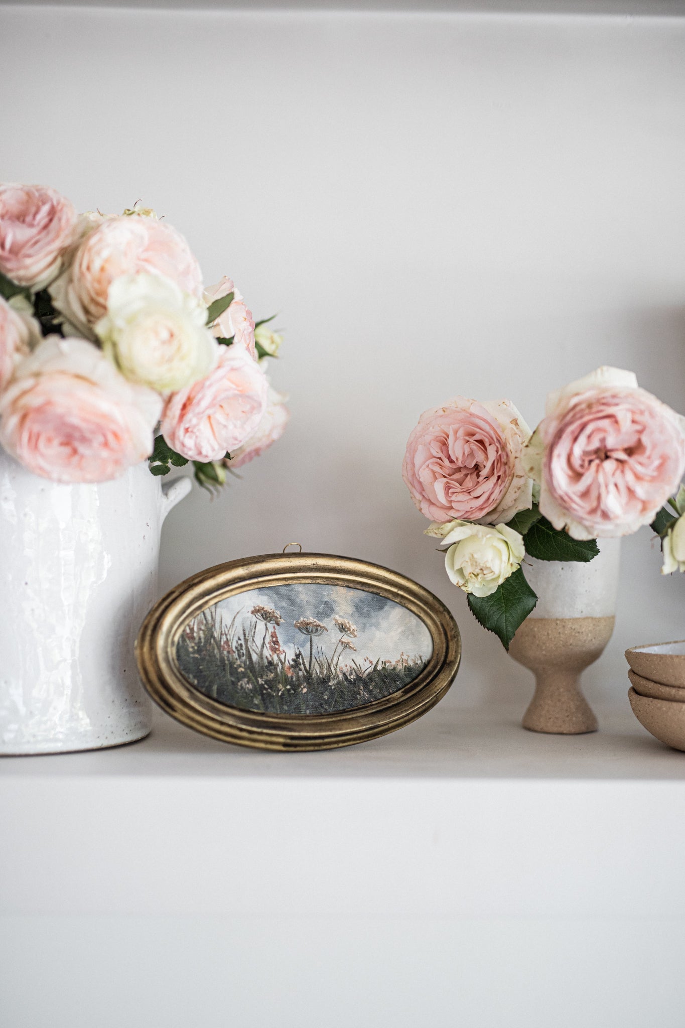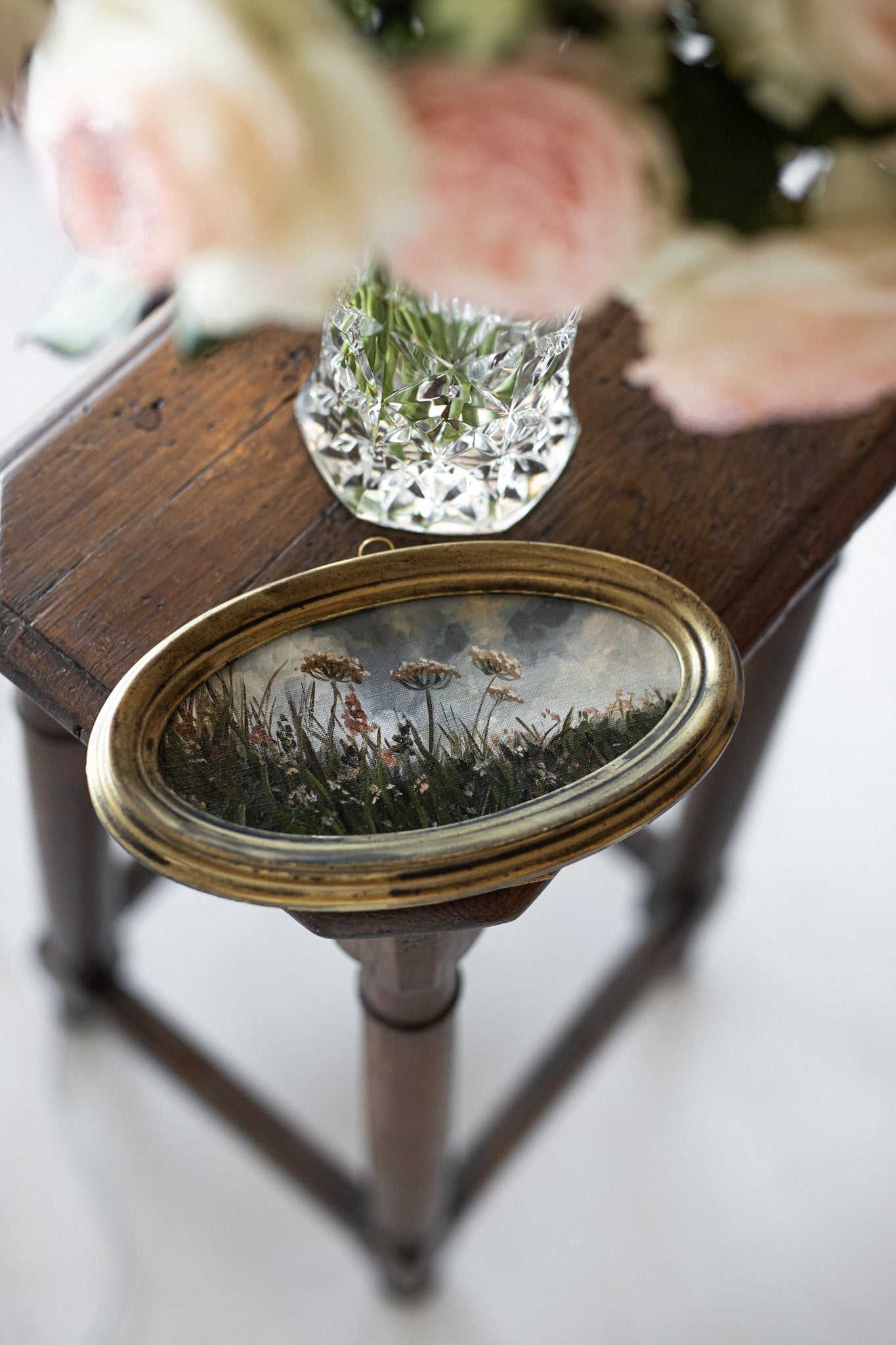 Field of Dreams represents our love for the Australian countryside interpreted within a petite French setting of fine proportions. This artwork is painted in the finest of watercolours by Ruxandra Maille. It has been framed in a handmade ceramic gilt piece, with a backing that allows you to style the artwork on a special shelf, table, or hang on a wall.