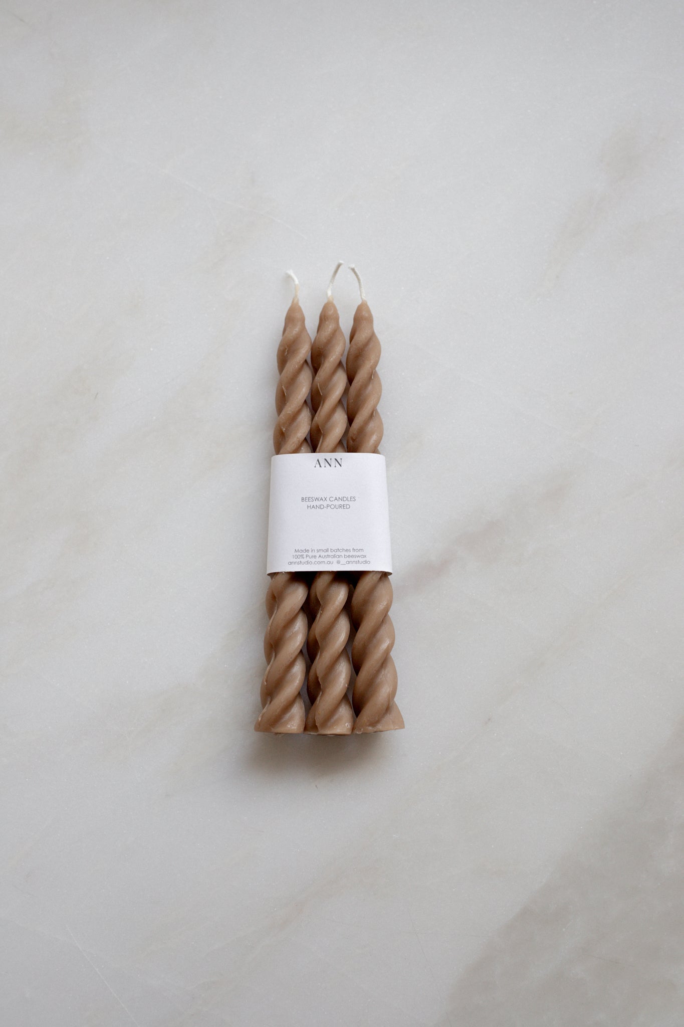An elegant set of three spiral beeswax candles to create ambiance in your table and home settings.