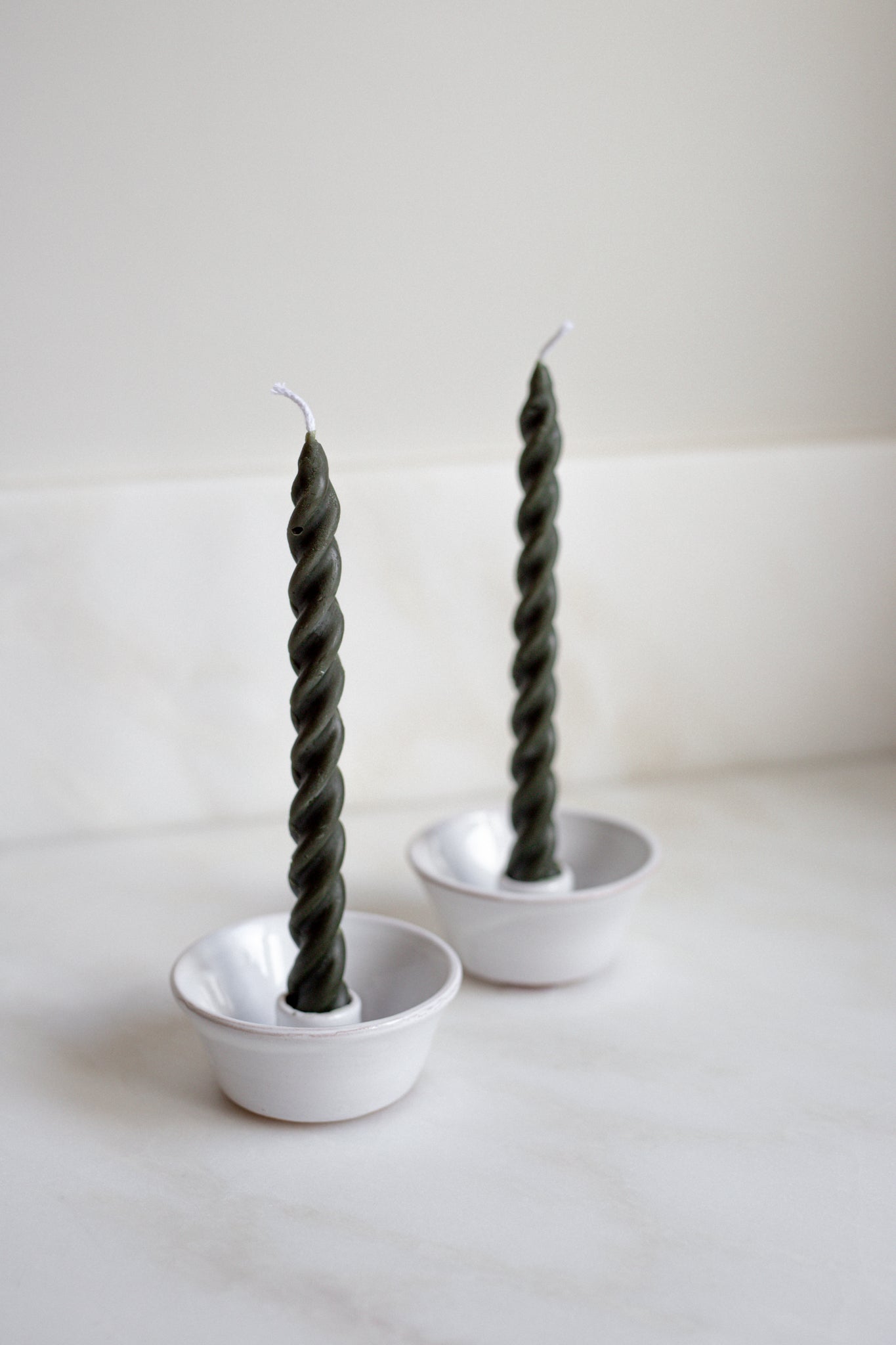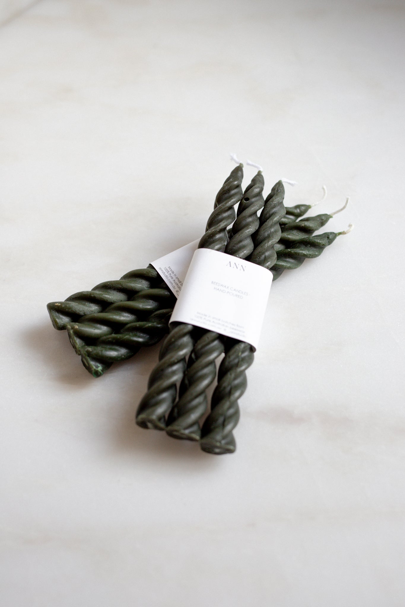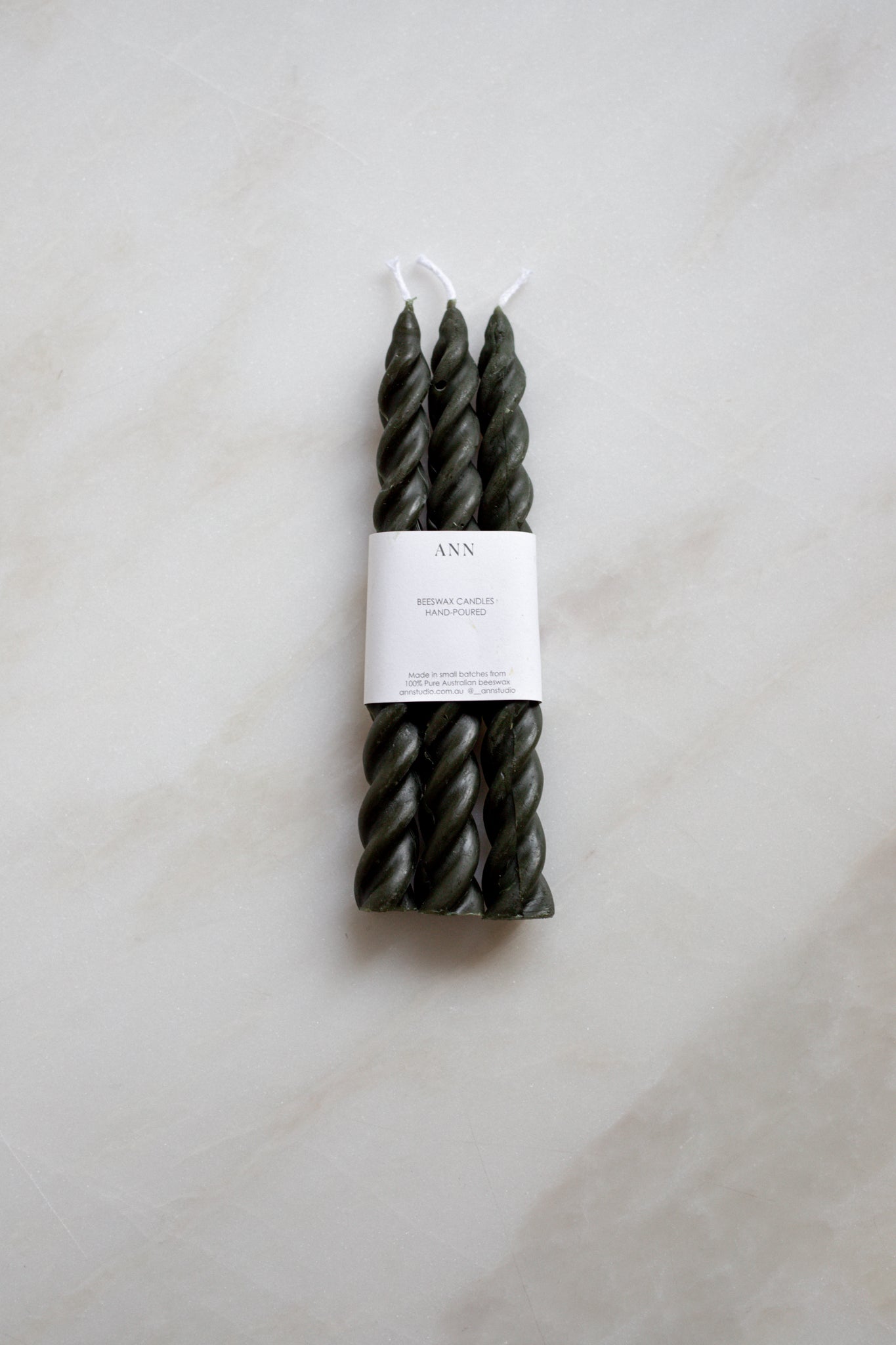 An elegant set of three spiral beeswax candles to create ambiance in your table and home settings.