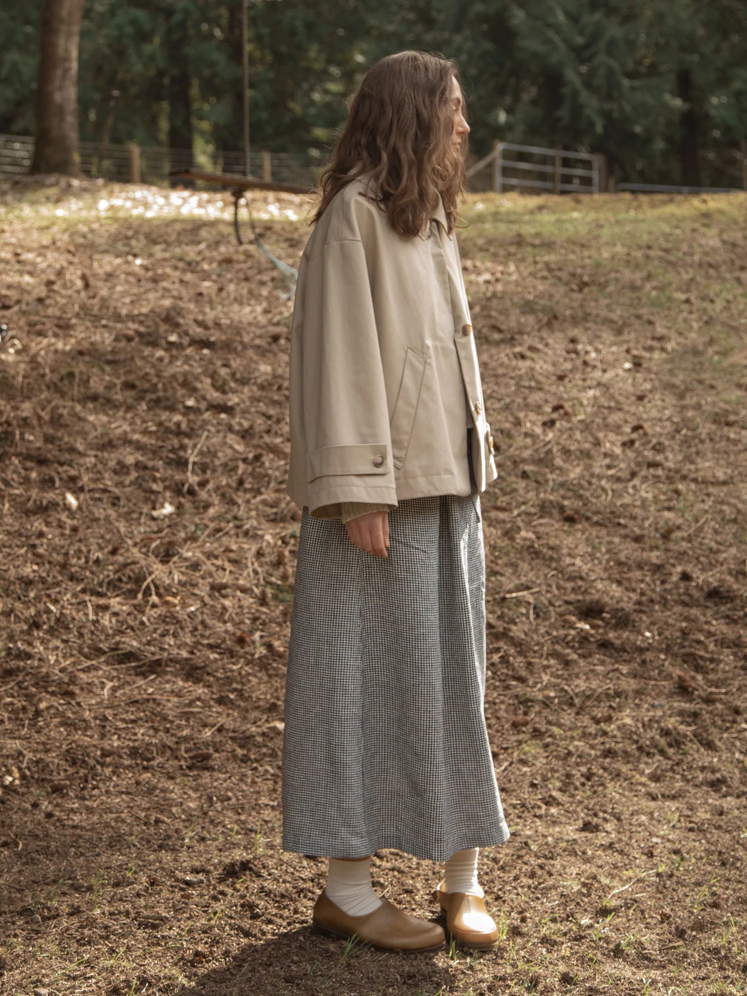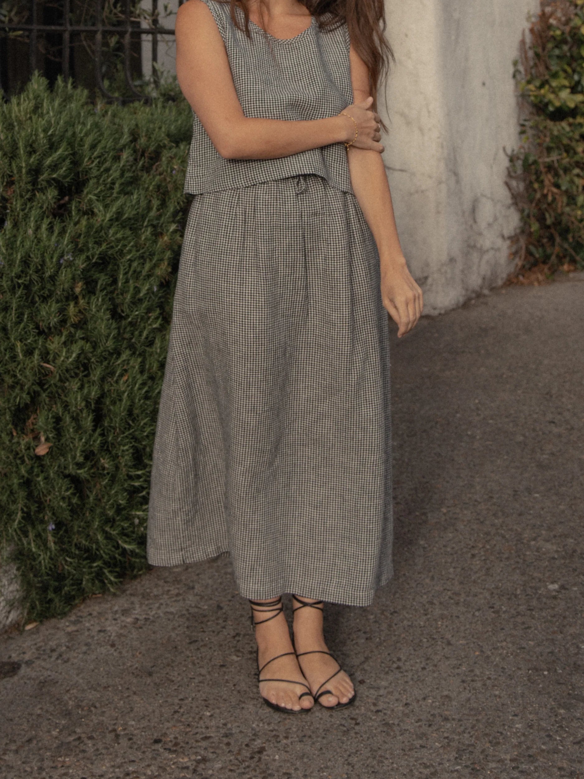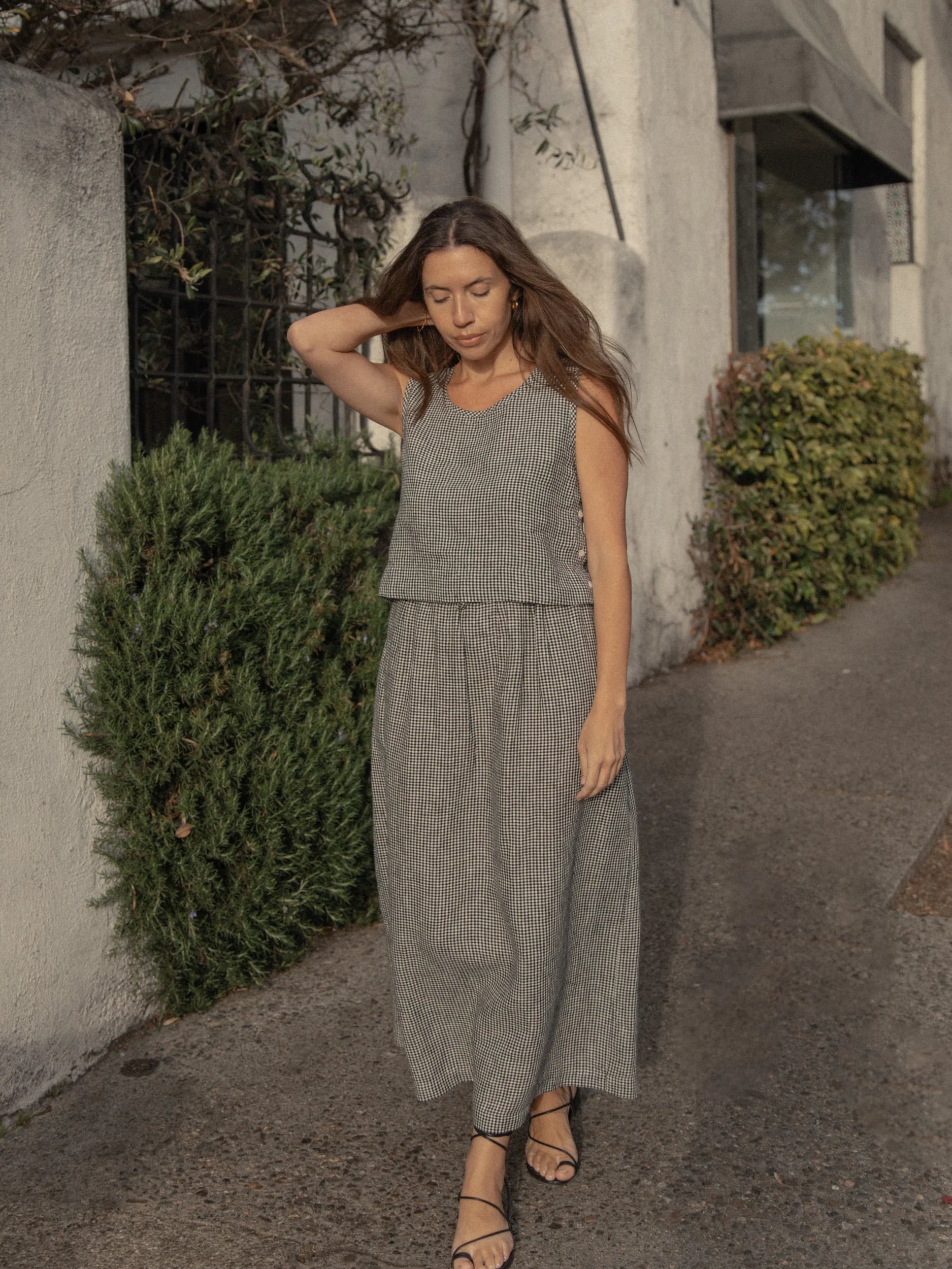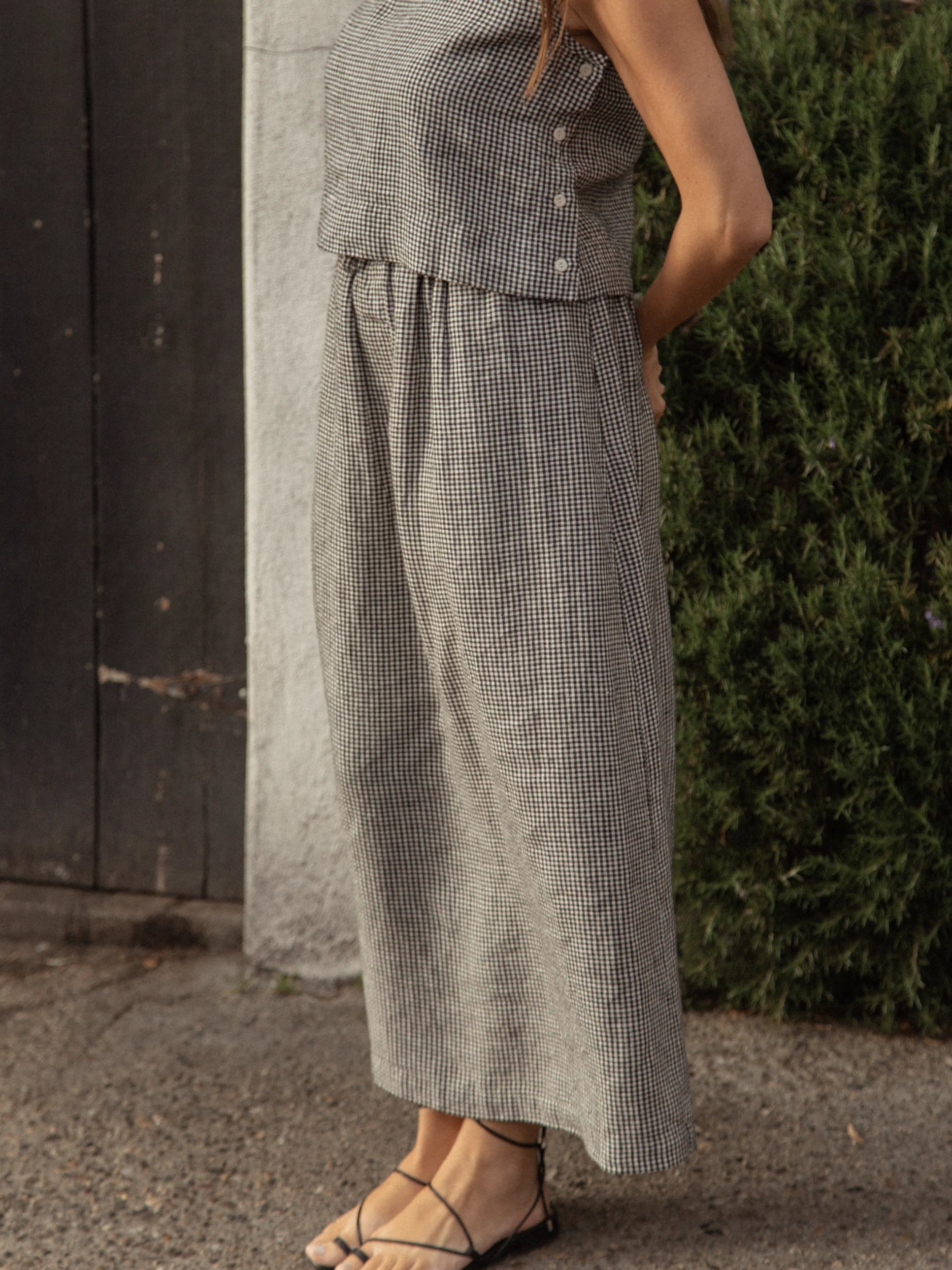A classic midi skirt featuring an elasticated drawstring waist, side seam pockets and a beautiful mid weight linen drape. Woven for spring in one of our signature prints, gingham noir. One of the GS bestselling styles.