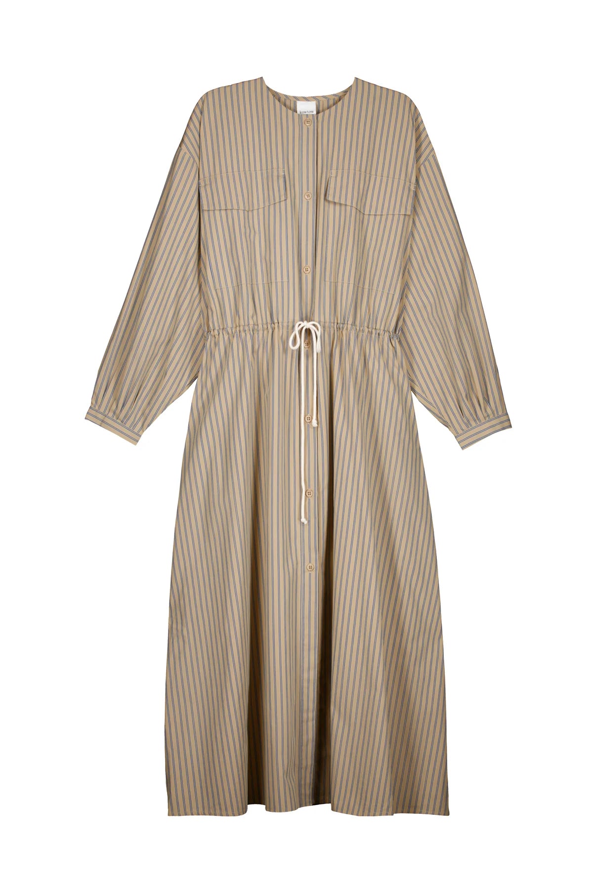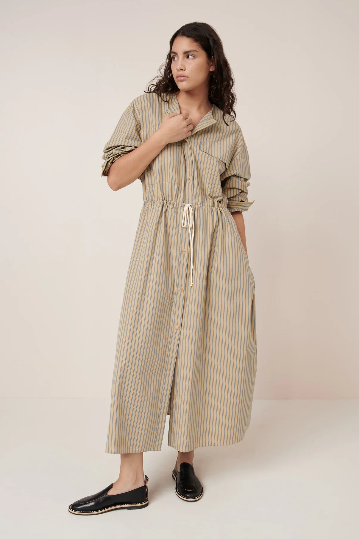 Defined by its utilitarian detailing, the Array Dress features oversized front pockets, a back pleat, and a slightly dropped waist. Designed for an oversized fit, it has a functional waist drawcord for versatile styling. Finished with side seam pockets and fastened with nut buttons through the front, this dress is craft from our double pinstripe organic cotton poplin shirting.
