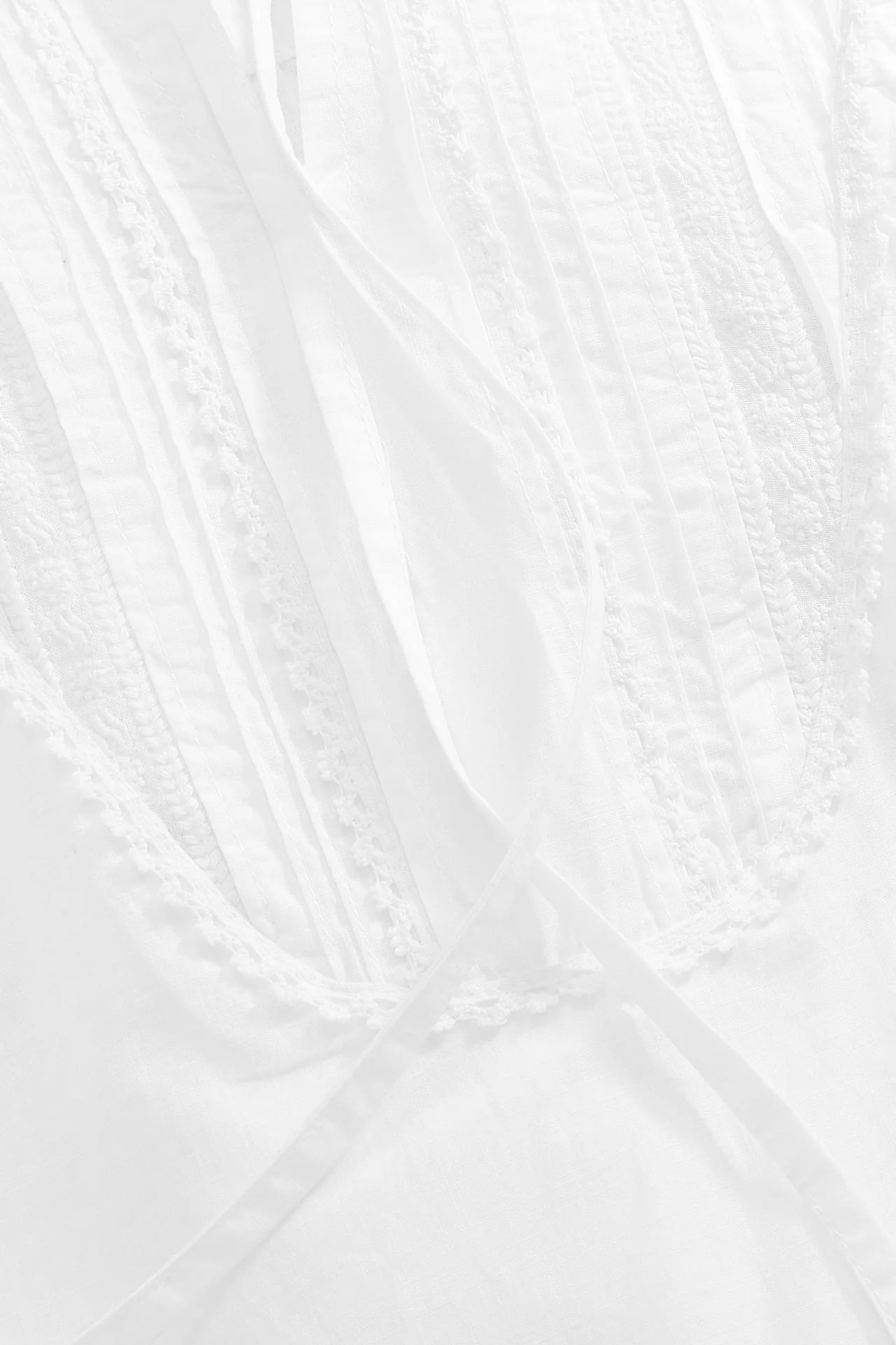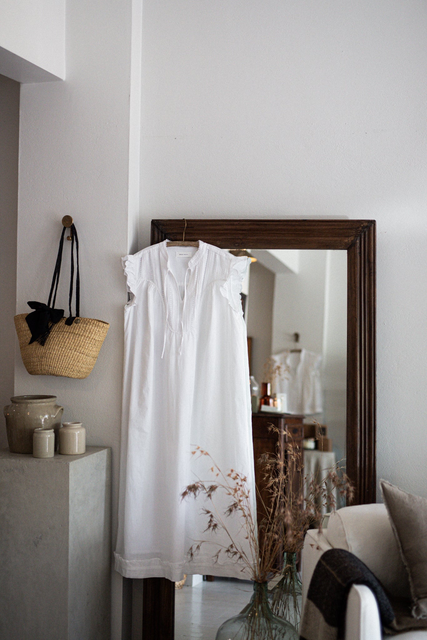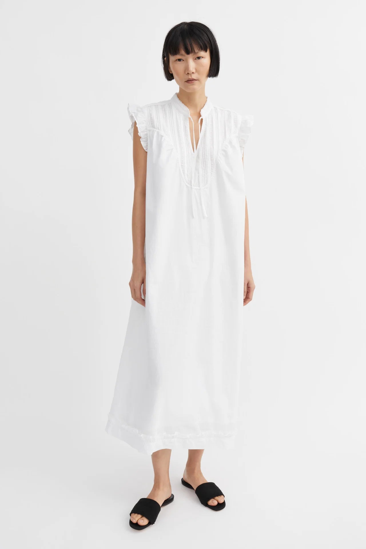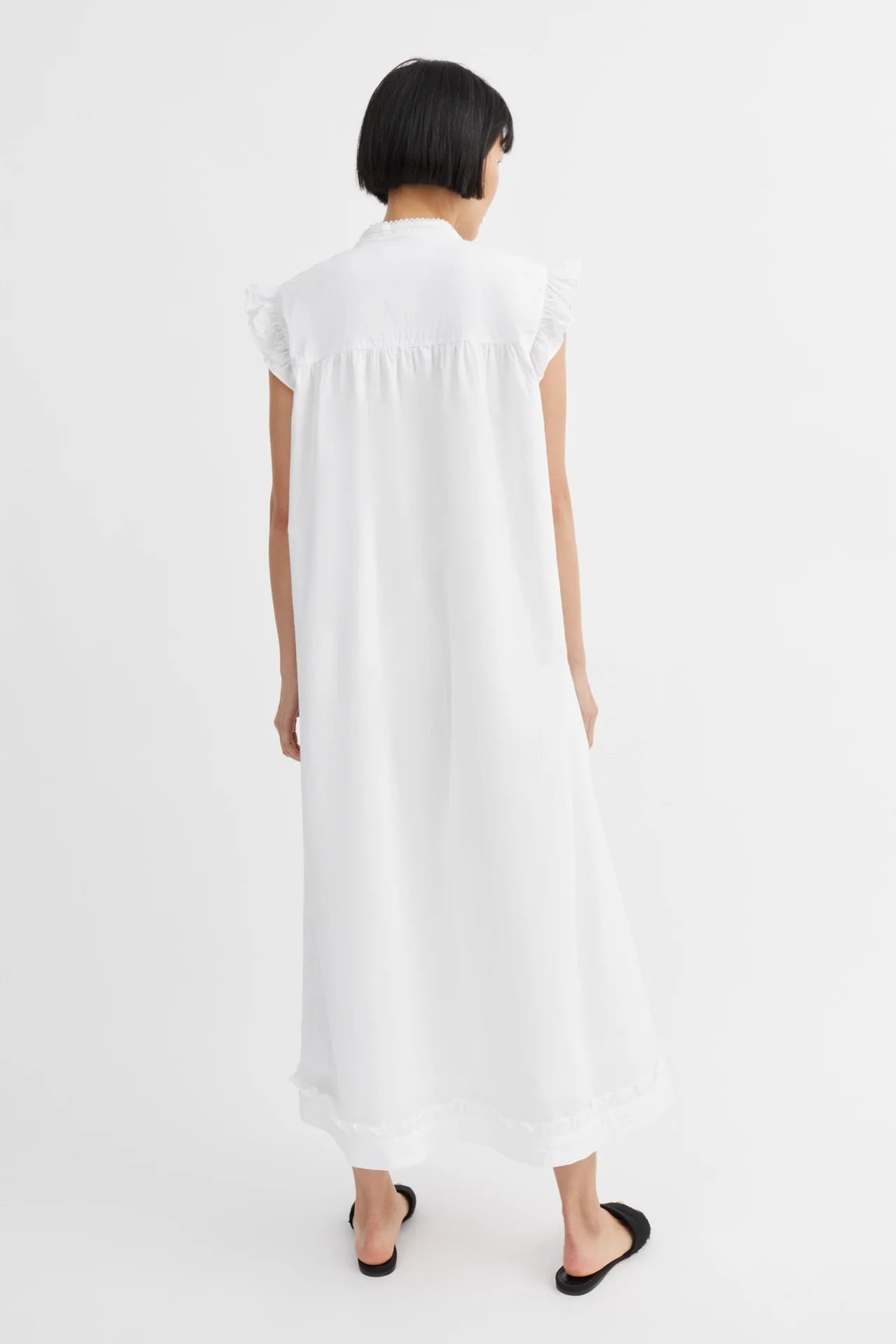 The Aurora Dress is a long loose-fit dress made from soft organic cotton. The dress has a classic Skall silhouette with a relaxed fit, delicate ruffle details at the sleeves, stand collar with neck ties and lace accents, giving it a romantic feel.