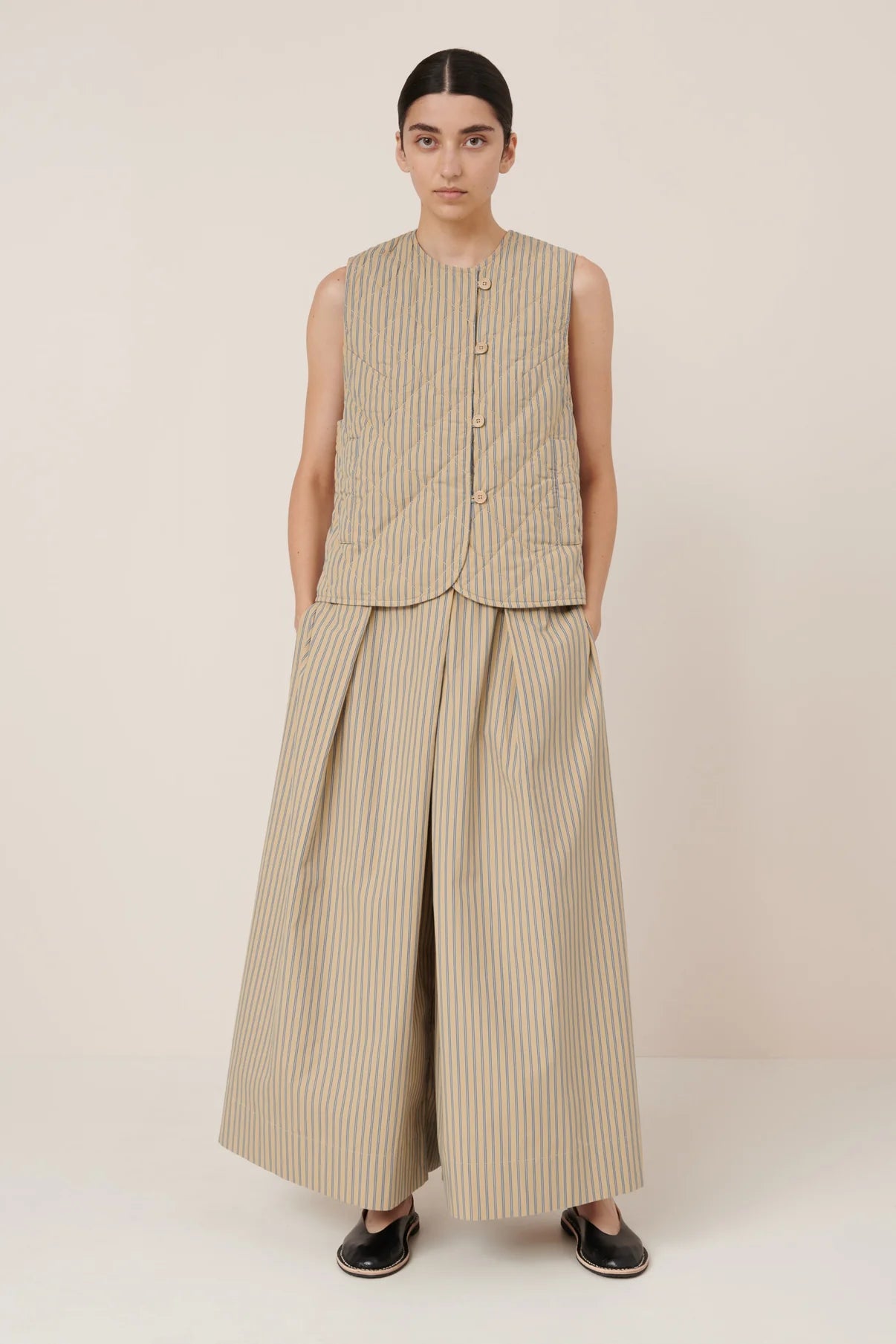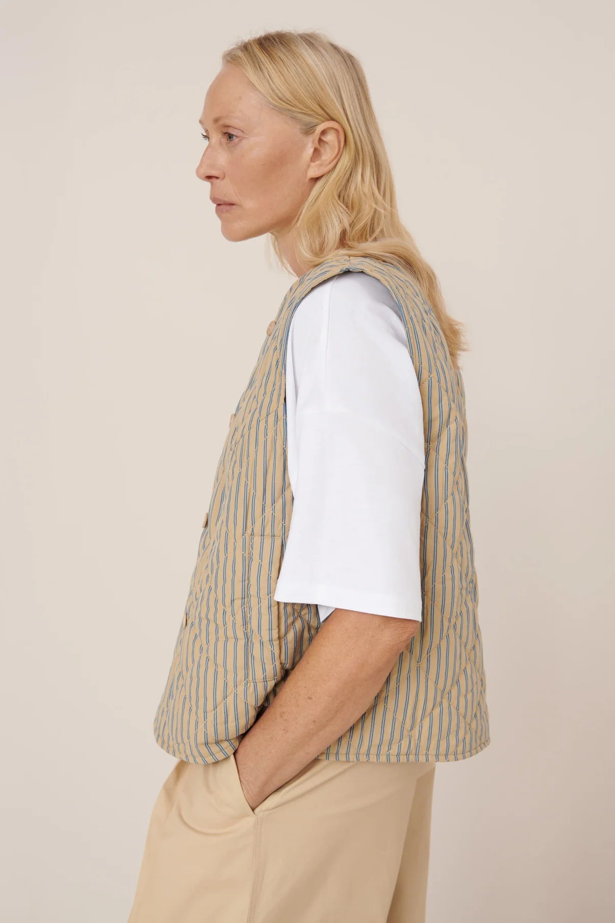 Inspired by traditional workwear, the Axis Vest is a lightweight quilted vest detailed with rouleau loops and nut buttons through the front. It has a standard fit, side pockets, inner pocket and is designed to be layered over your favourite tee. Crafted from organic cotton poplin in a Double Pinstripe pattern and quilted with lightweight cotton wadding, it balances functionality with timeless style.