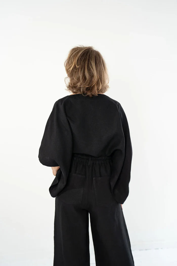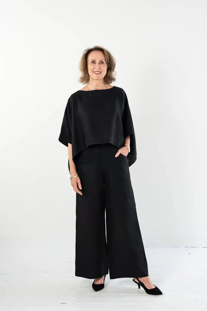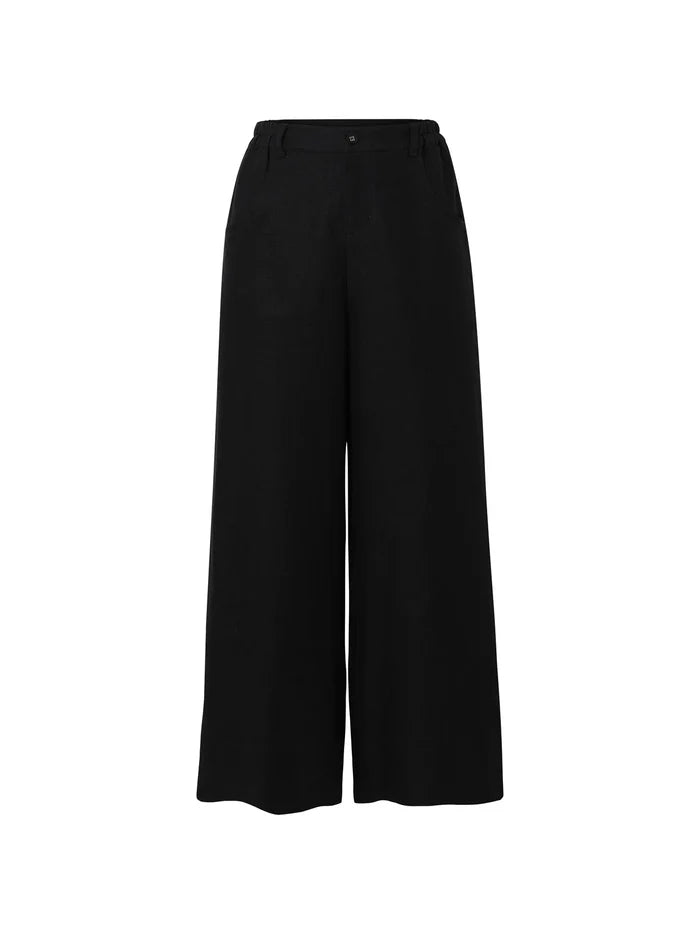 The Essentials Collection Bowie Pant in black linen is a classic high-waisted pant. The front of the pant sits flat on a conventional waistband with belt loops and a zip front closure. The back section of the waistband is comfortably elasticated. Pockets are located at the front and back for added functionality.