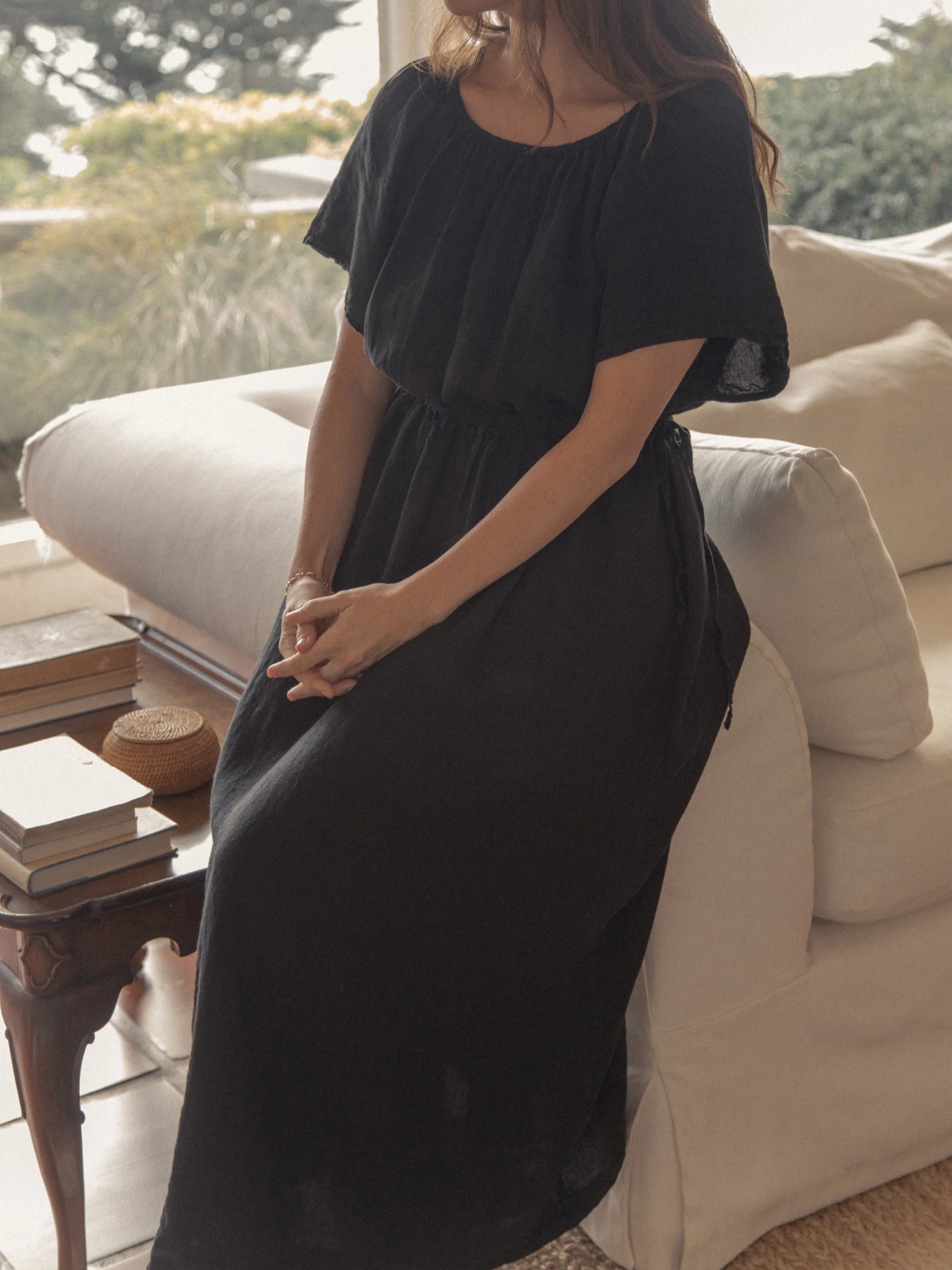 The Clara Dress is a linen midi dress featuring a gathered scoop neckline, wide soft sleeves, an adjustable drawstring waist, and midi skirt.