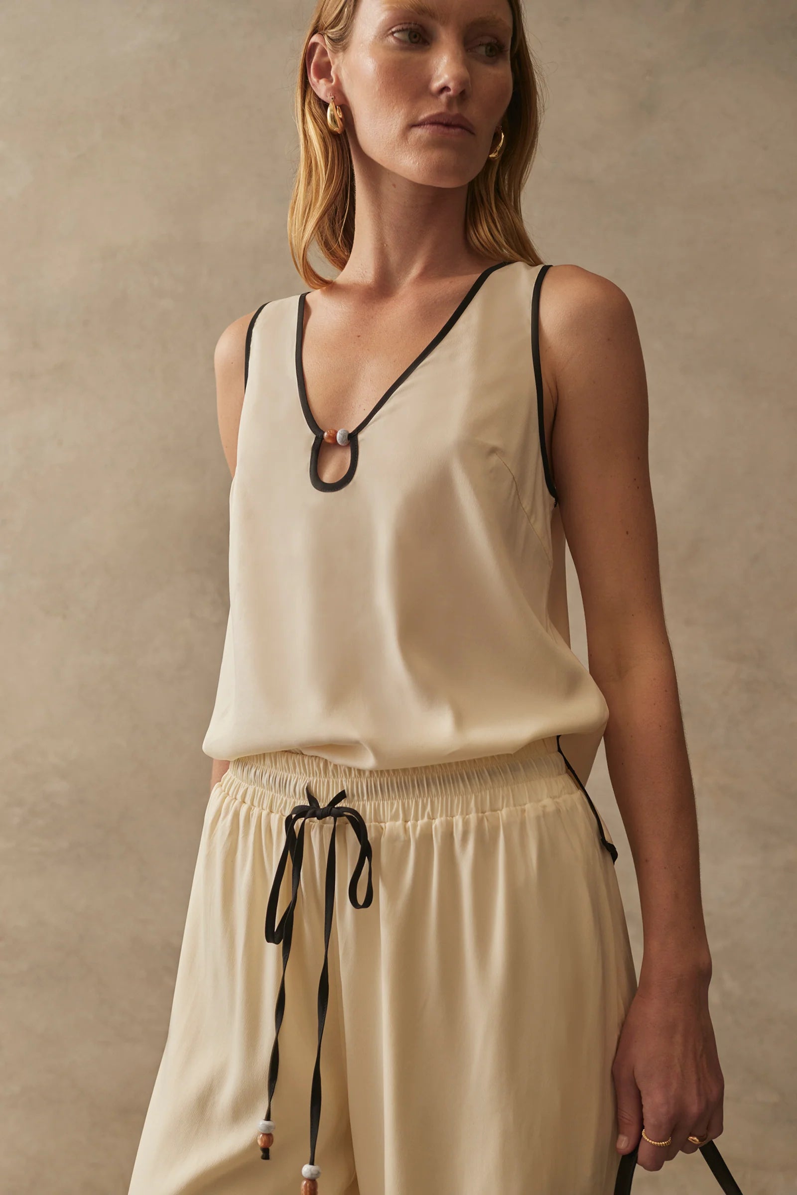 The Cleonie top is the essential breezy dressed-up tank style that you'll be wearing all summer long. The v-neckline features a keyhole cutout with custom bobbles to accentuate the silhouette. Style as a matching pair with our Olsen Pants for an effortless look.