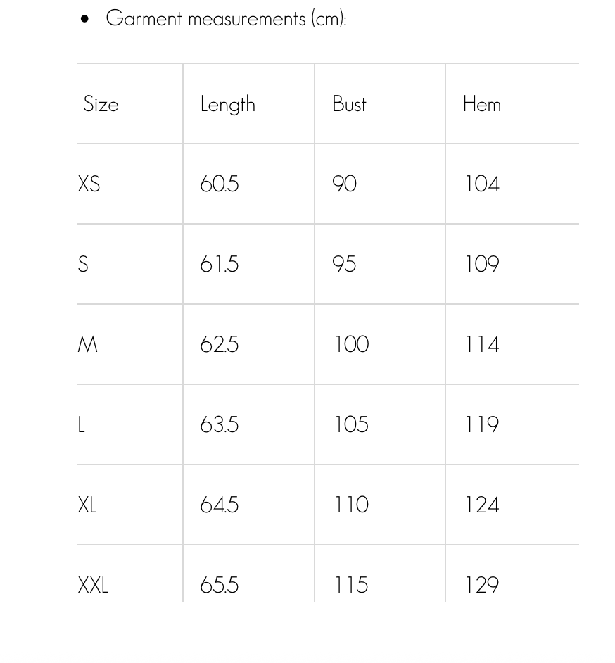 Fits true to size. Au size small / length from shoulder to hem 66.5cm. Our models are wearing a size XS. Please refer to the final picture for sizing.