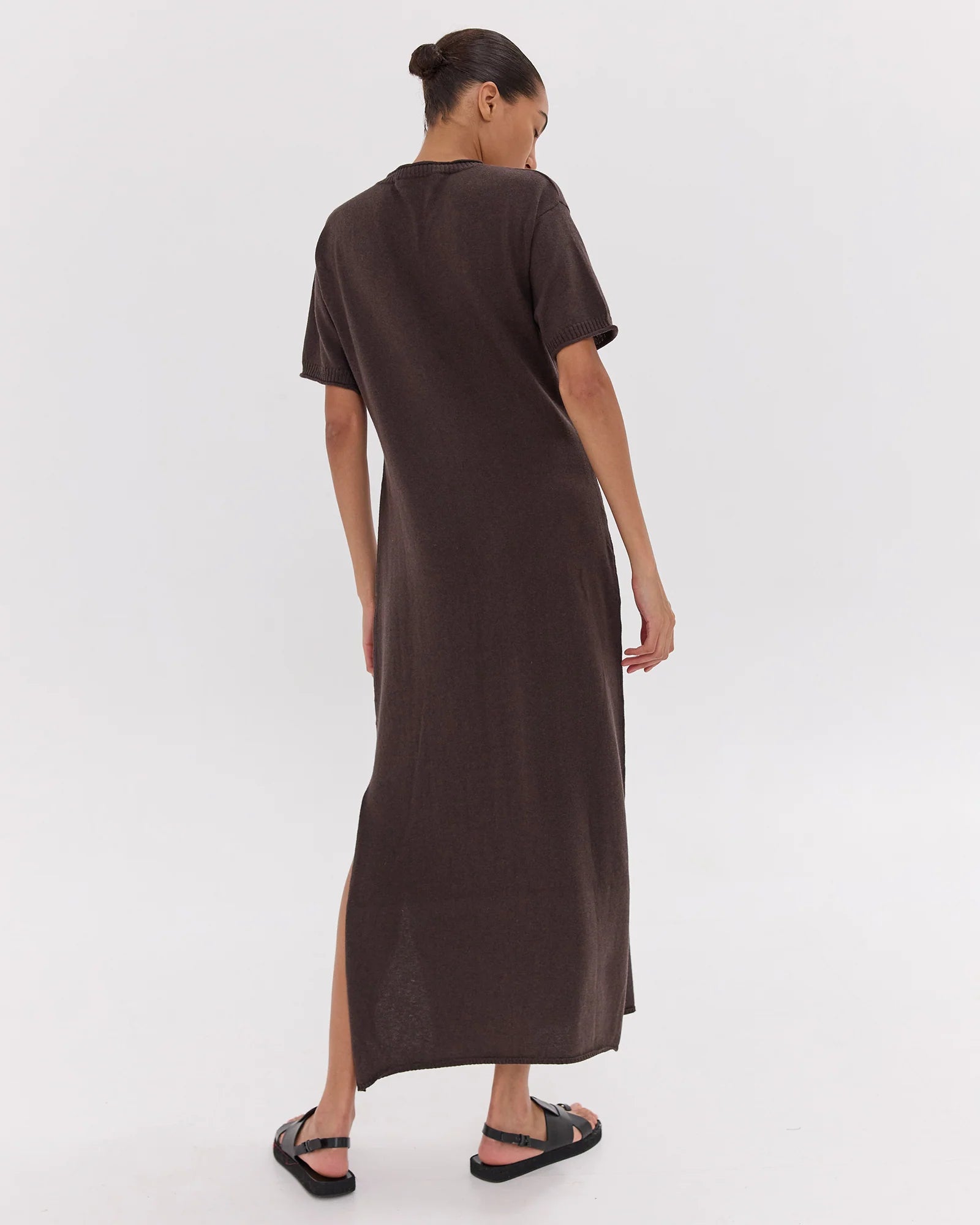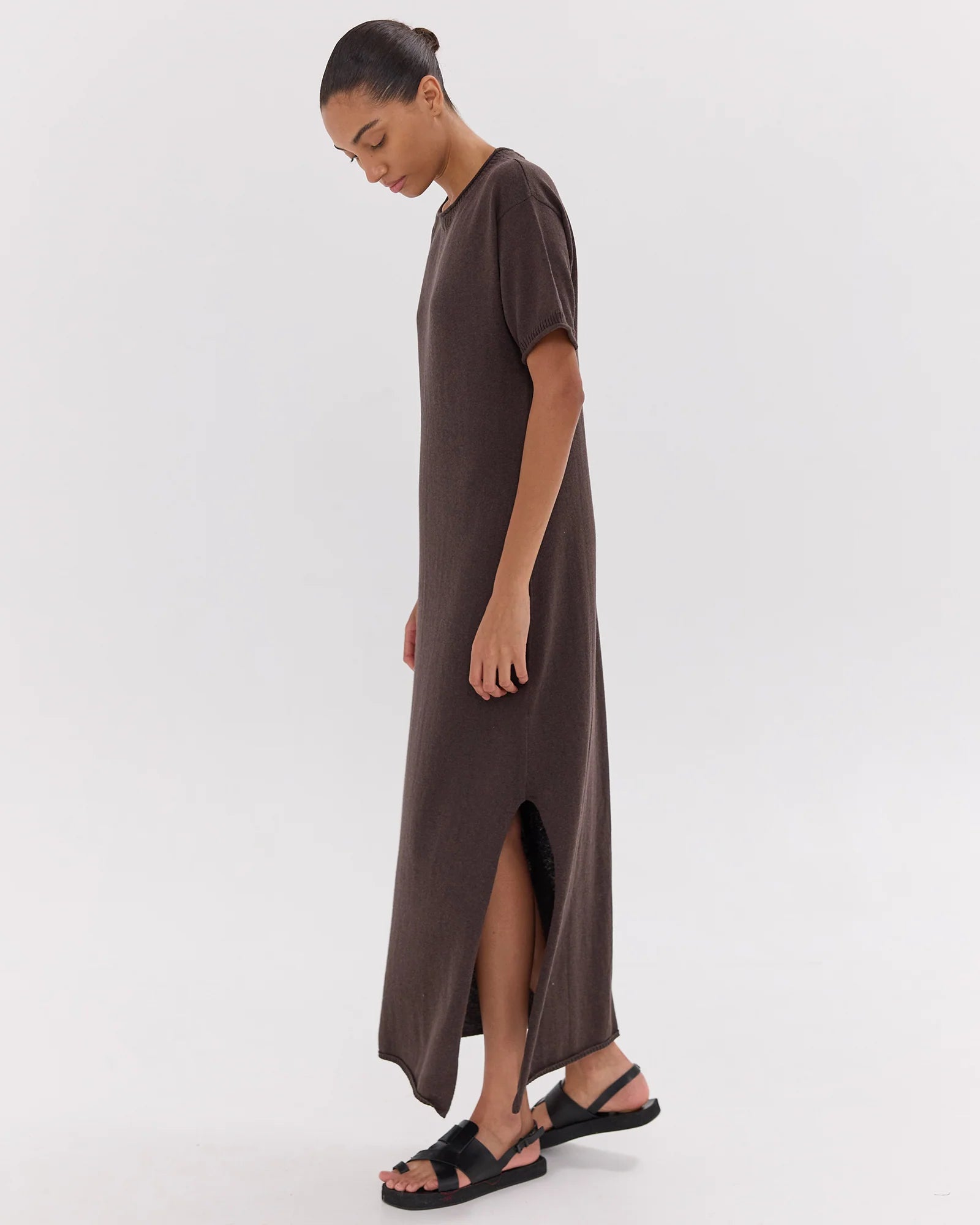 Knitted from 95% GOTS certified organic cotton and 5% cashmere, this tee dress features a relaxed silhouette with a classic crew neckline, short sleeves, and a side split. Soft and breathable, it offers effortless wear with a refined, contemporary finish.
