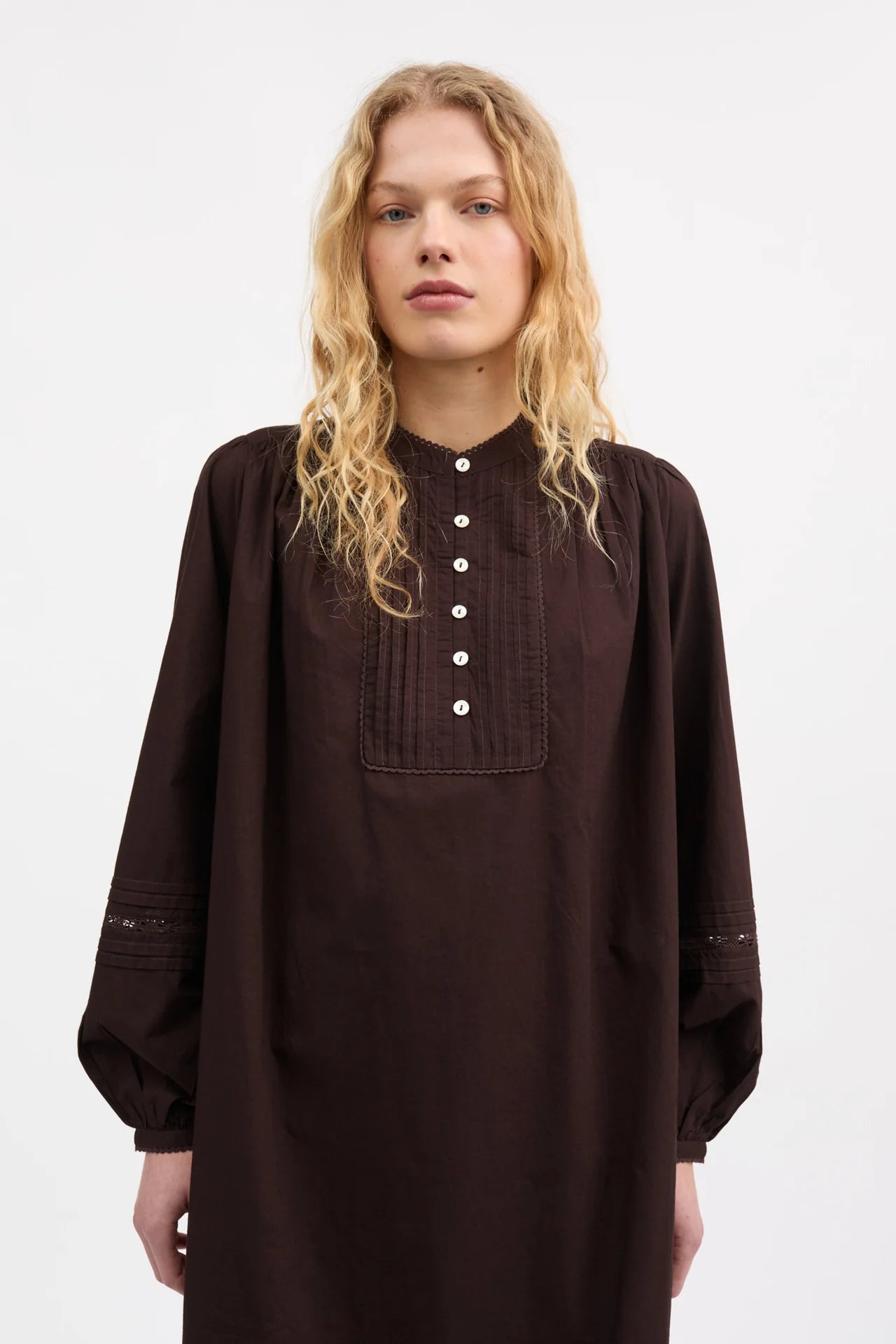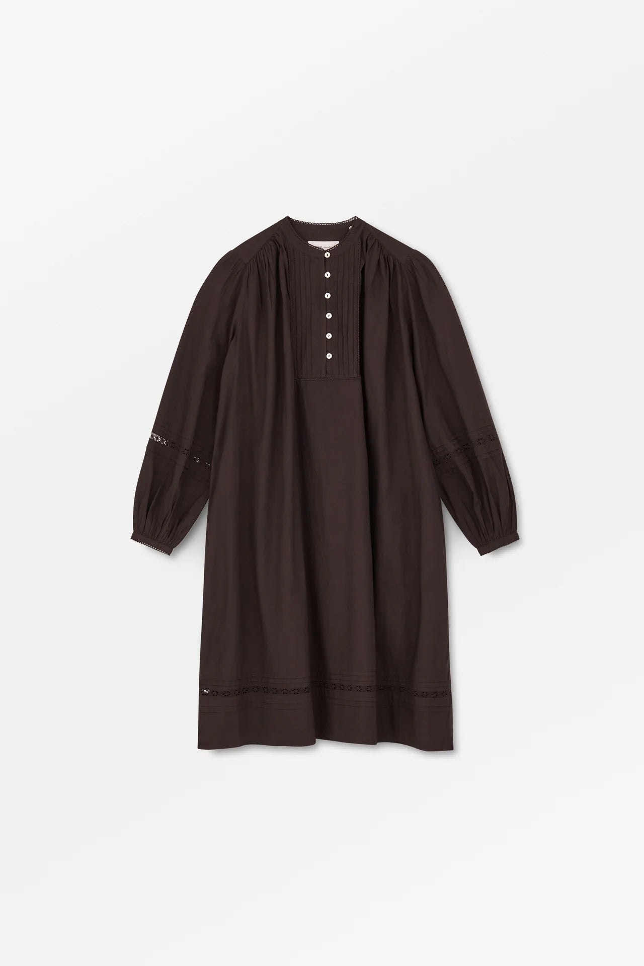 The Leaf Shirtdress is an easy fit 100% organic cotton dress with a round collar and pin-tucked bib front. Pleats on the shoulder give way to balloon sleeves trimmed with lace at the cuff - a detail that also appears at the neck. Lace inserts run through the arms and around the hem of the skirt which falls to just below the knee. Six buttons with loops provide the fastening down the front.