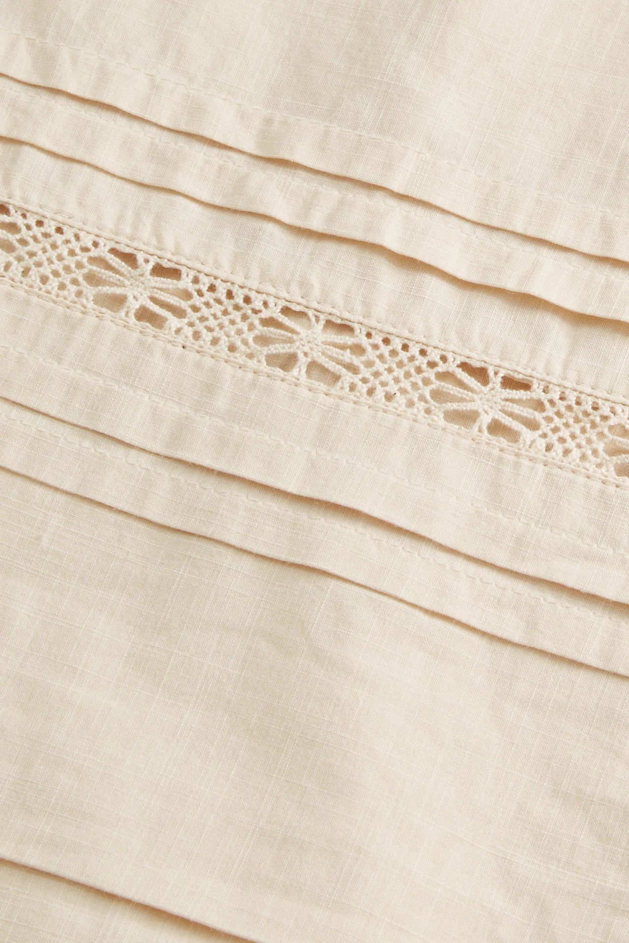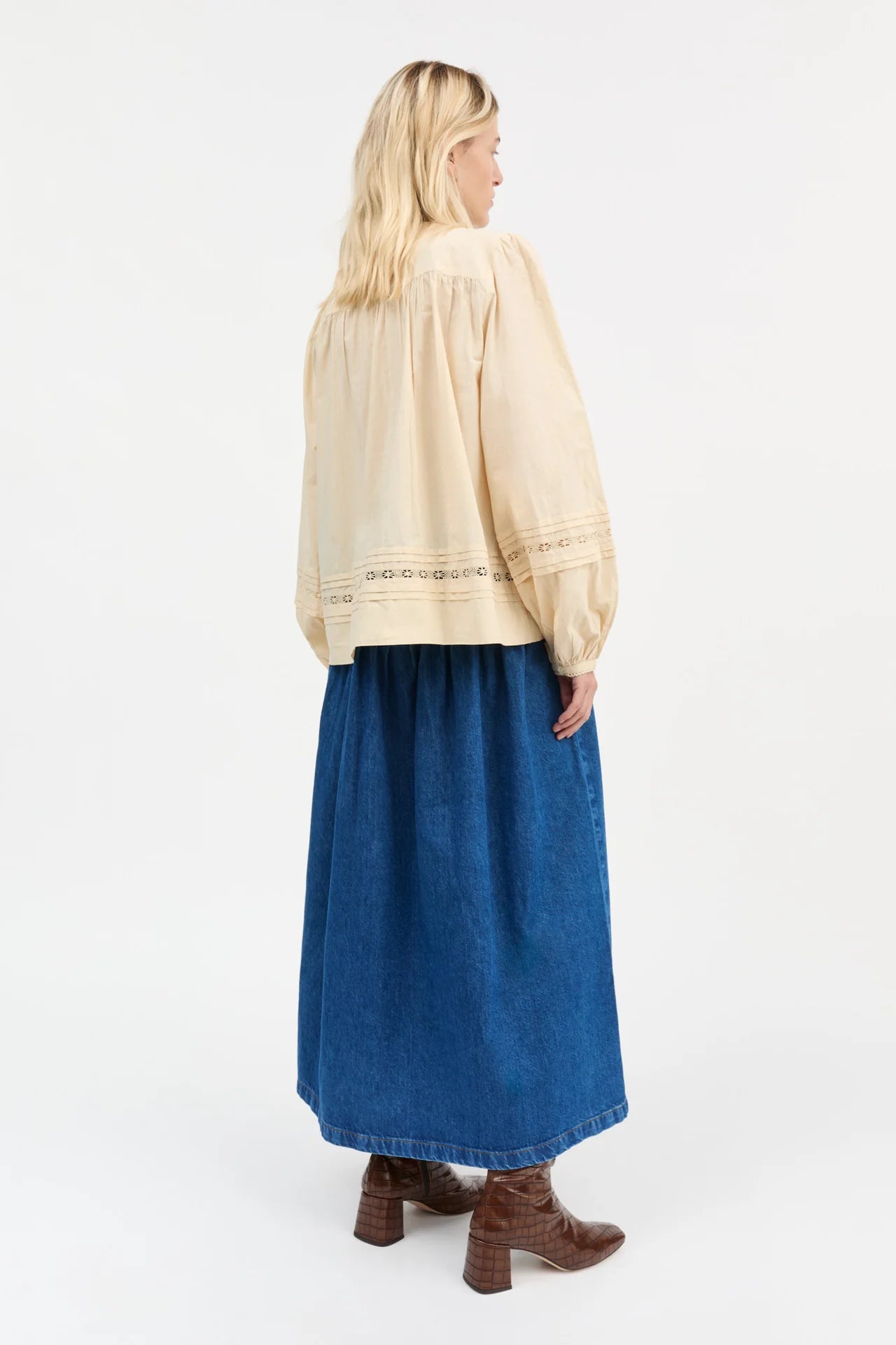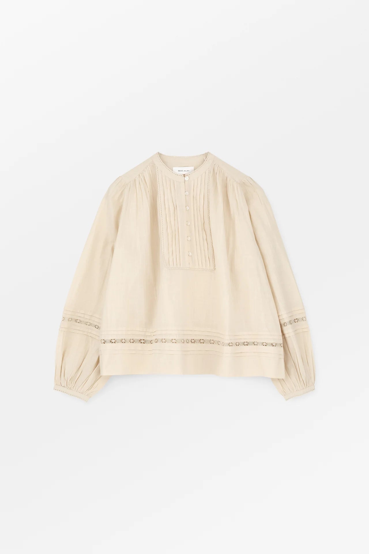The Leaf Blouse in 100% organic cotton has delicate tucks falling from its round collar creating a flattering silhouette. Lace inserts run down the front and back of the blouse and across the balloon sleeves that are gathered into finely bound cuffs.