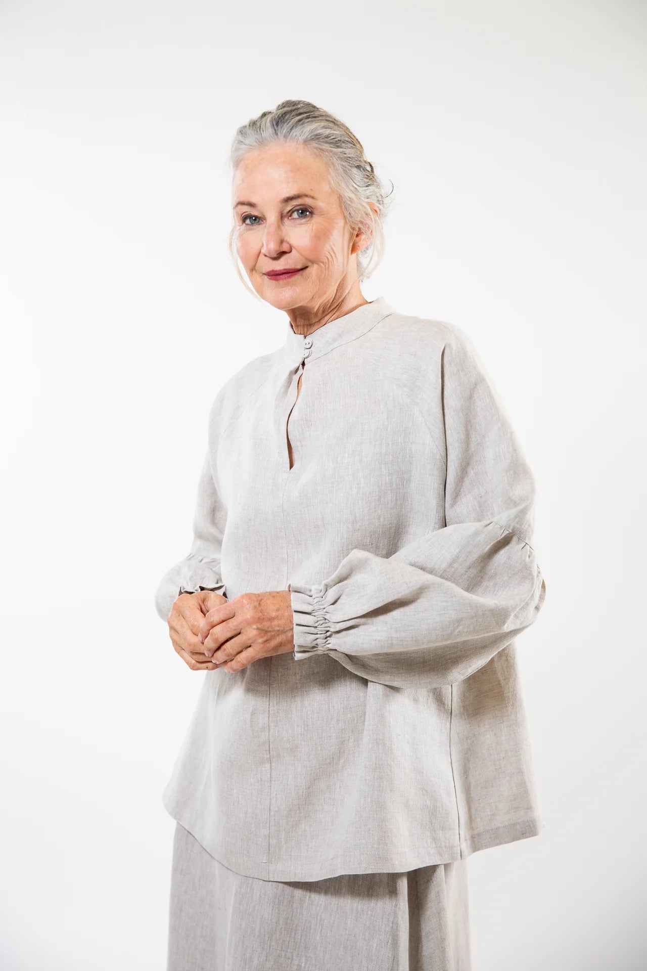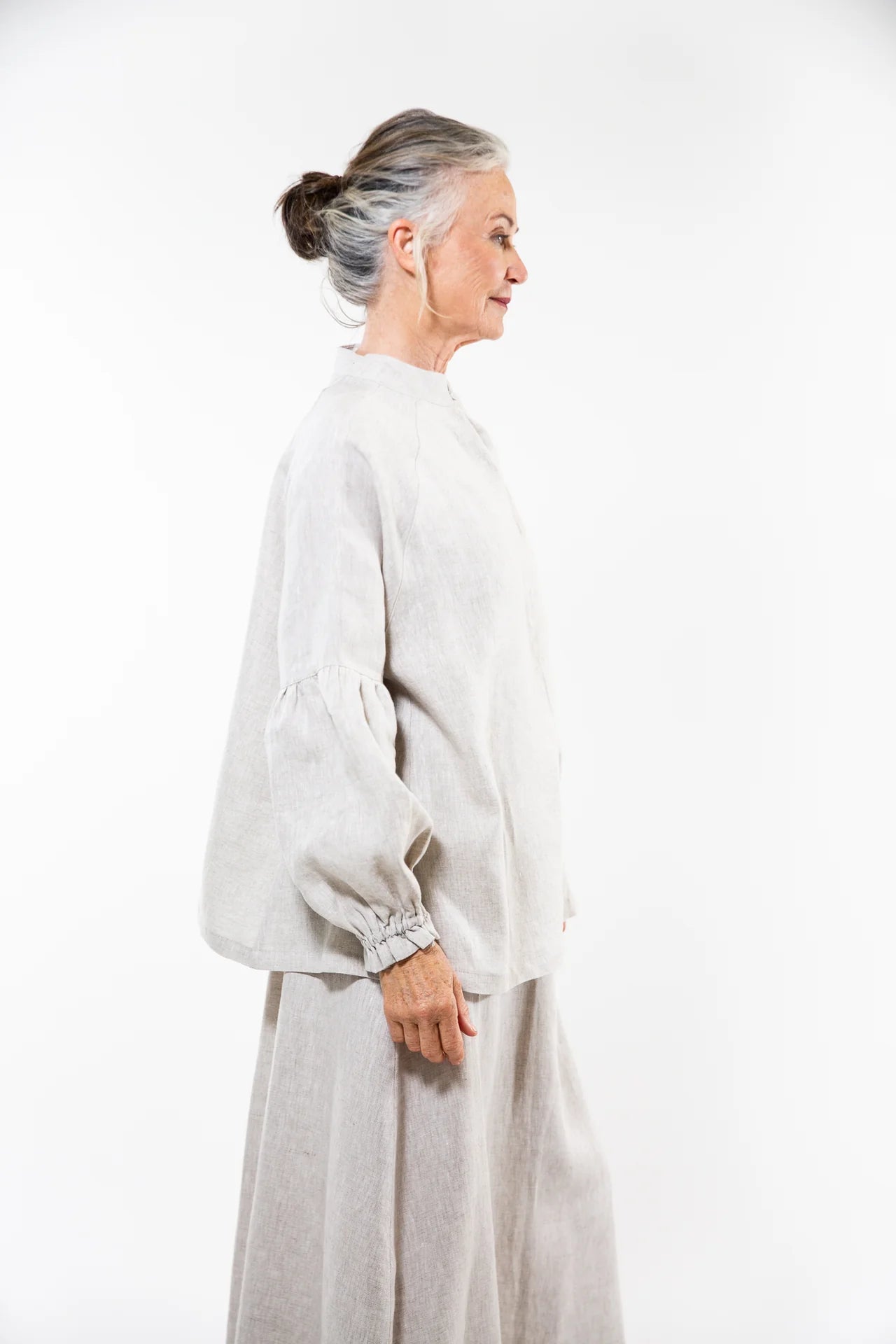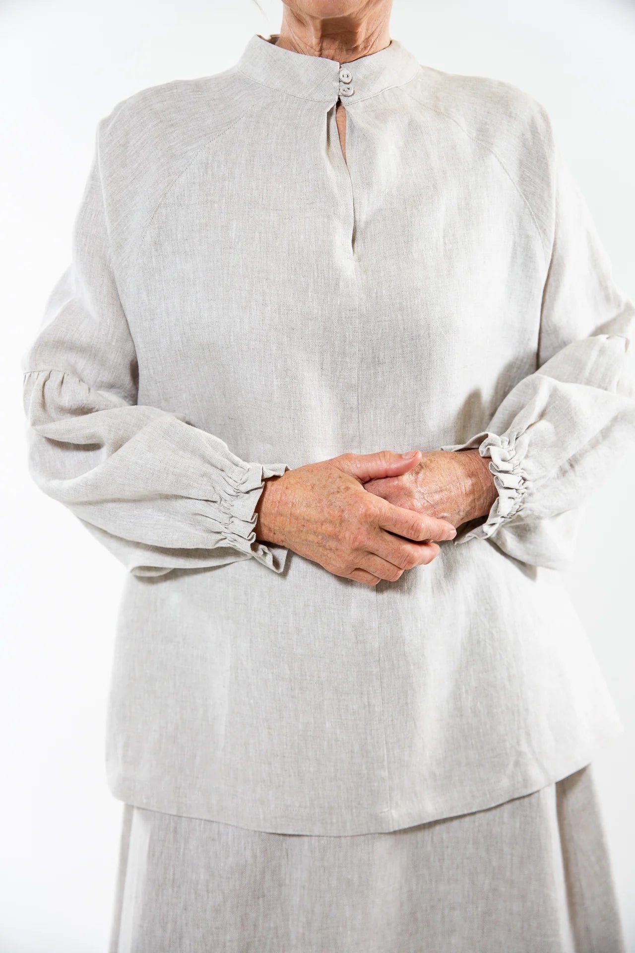 The Leonie top may be tucked in or worn loose depending on your preference. The statement raglan cut bishop sleeves add volume leading to a cinched-in elasticated cuff giving a slightly frilled effect.