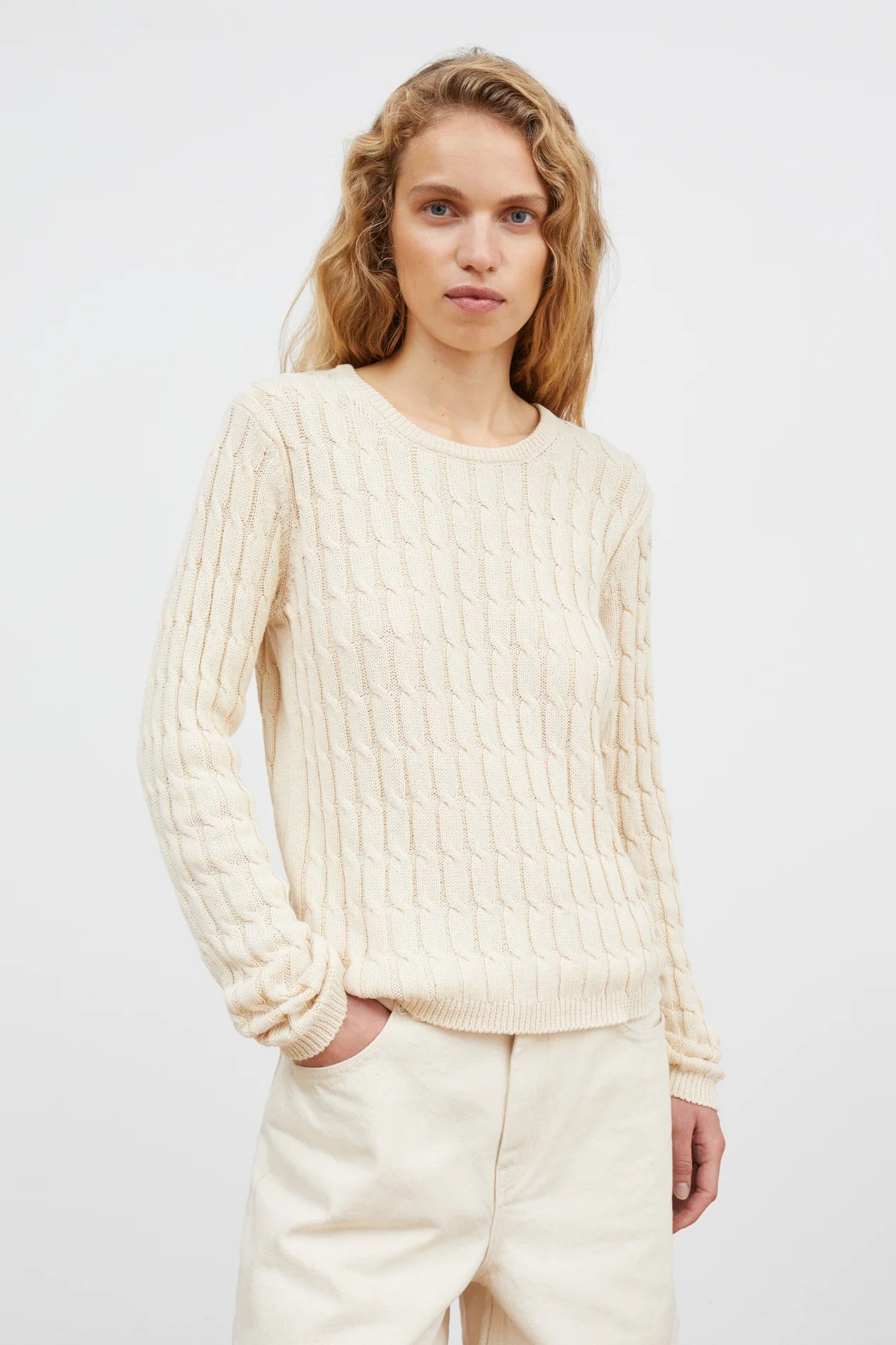 Such a lovely, classic heirloom knit - made in Italy. Versatile throughout the seasons, this 100% organic cotton sweater is in a fine cable design. The round neck, cuffs and hem are finished with a narrow rib.