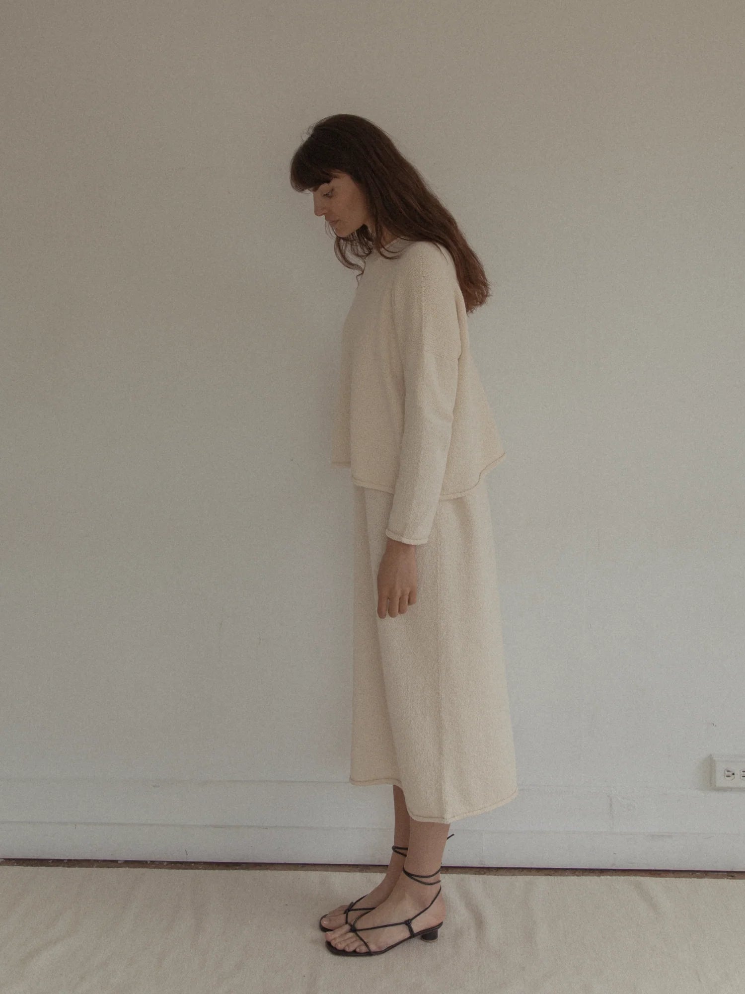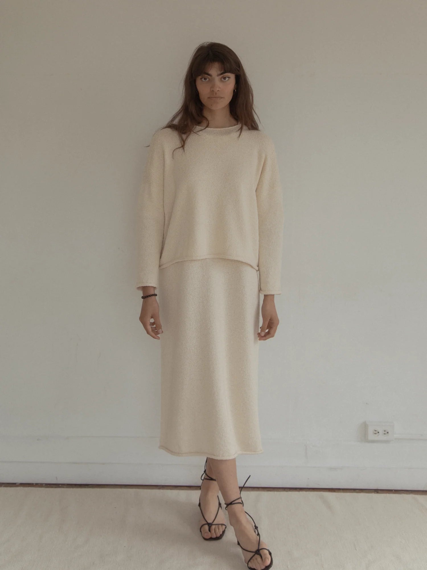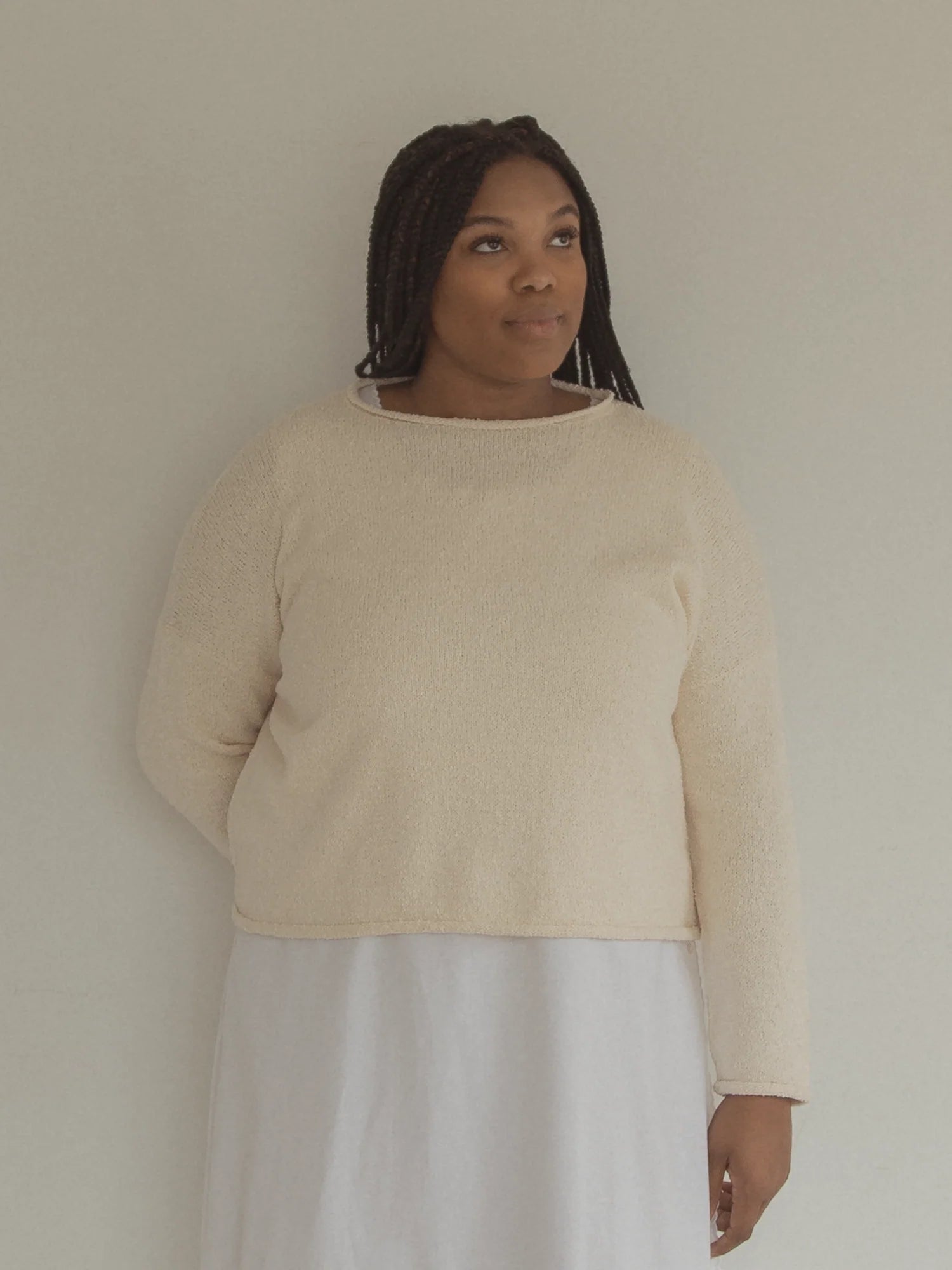 The Mariel is a soft, boxy pullover featuring a rolled hem detail. Knit in a soft organic cotton boucle, a perfect weight for warmer weather.