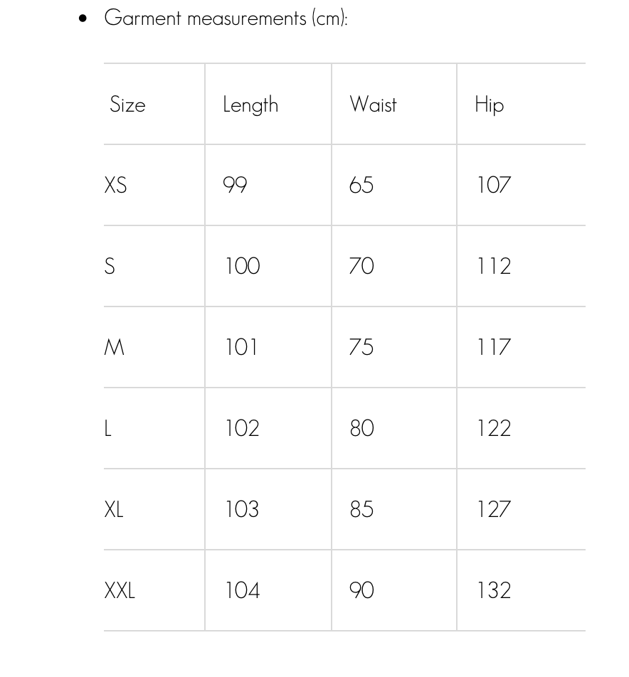 Fits true to size. Au size small / length from waist to hem 100cm. Our models are wearing a size XS. Please refer to the final picture for sizing.