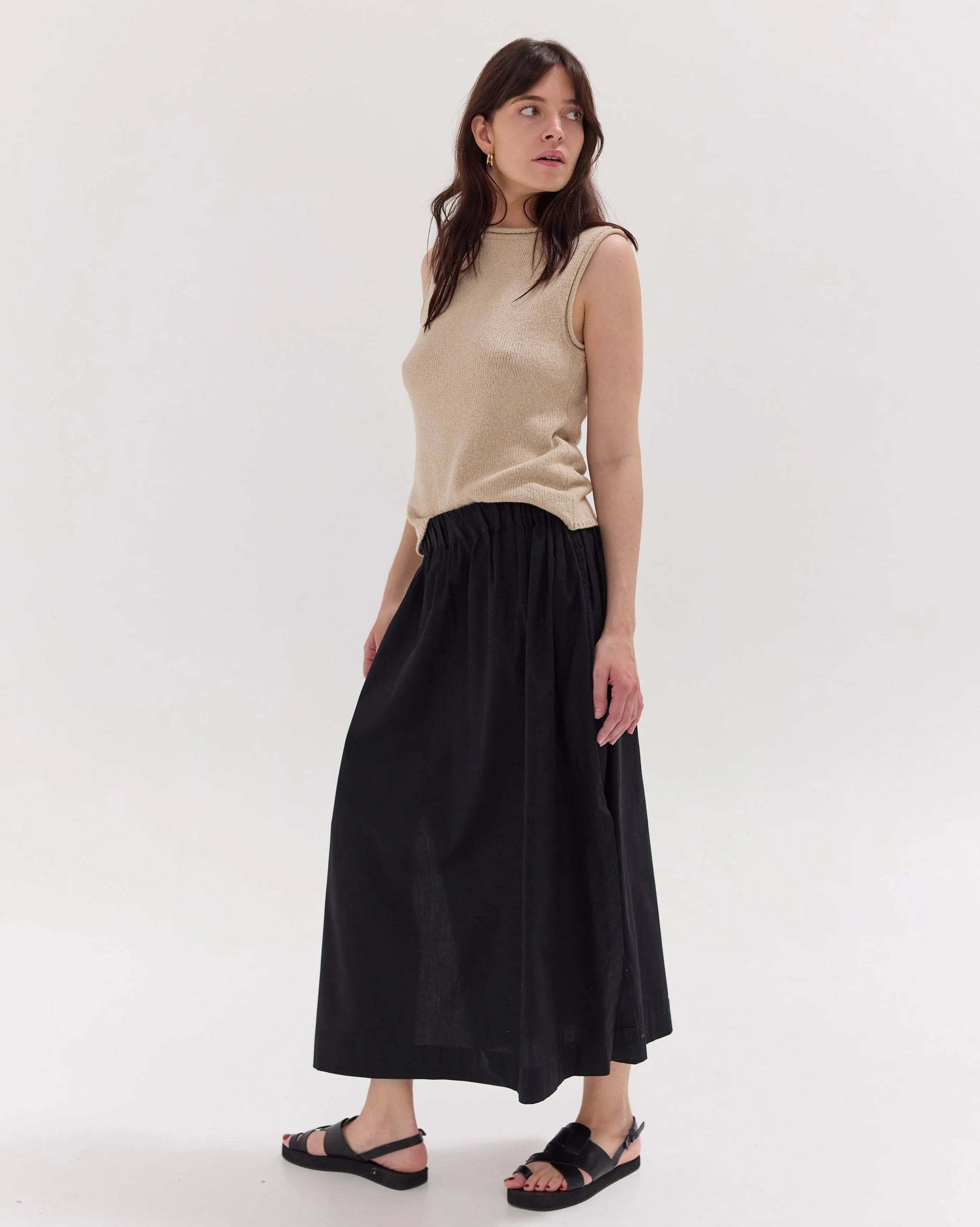 Crafted from 100% cotton, the Split Skirt is designed for ease and versatility. Featuring a soft elastic waistband that can be worn on the waist or hips, it falls effortlessly with a fluid drape. Side-seam pockets add quiet functionality, while splits on both sides allow for natural movement and a sense of relaxed refinement.