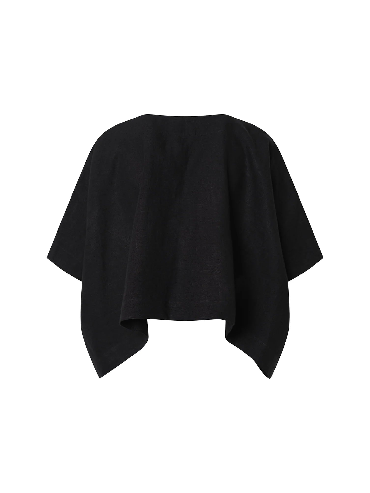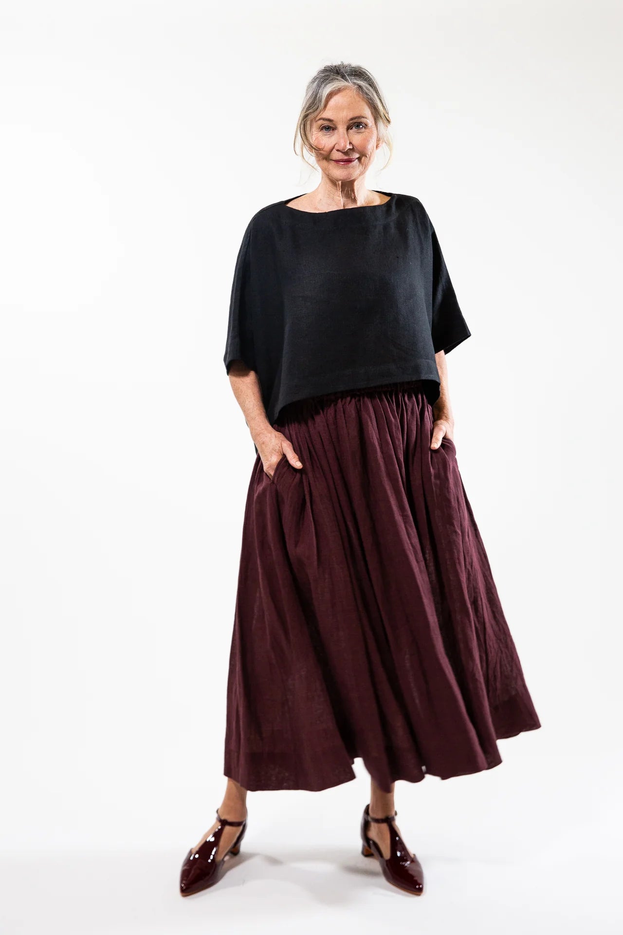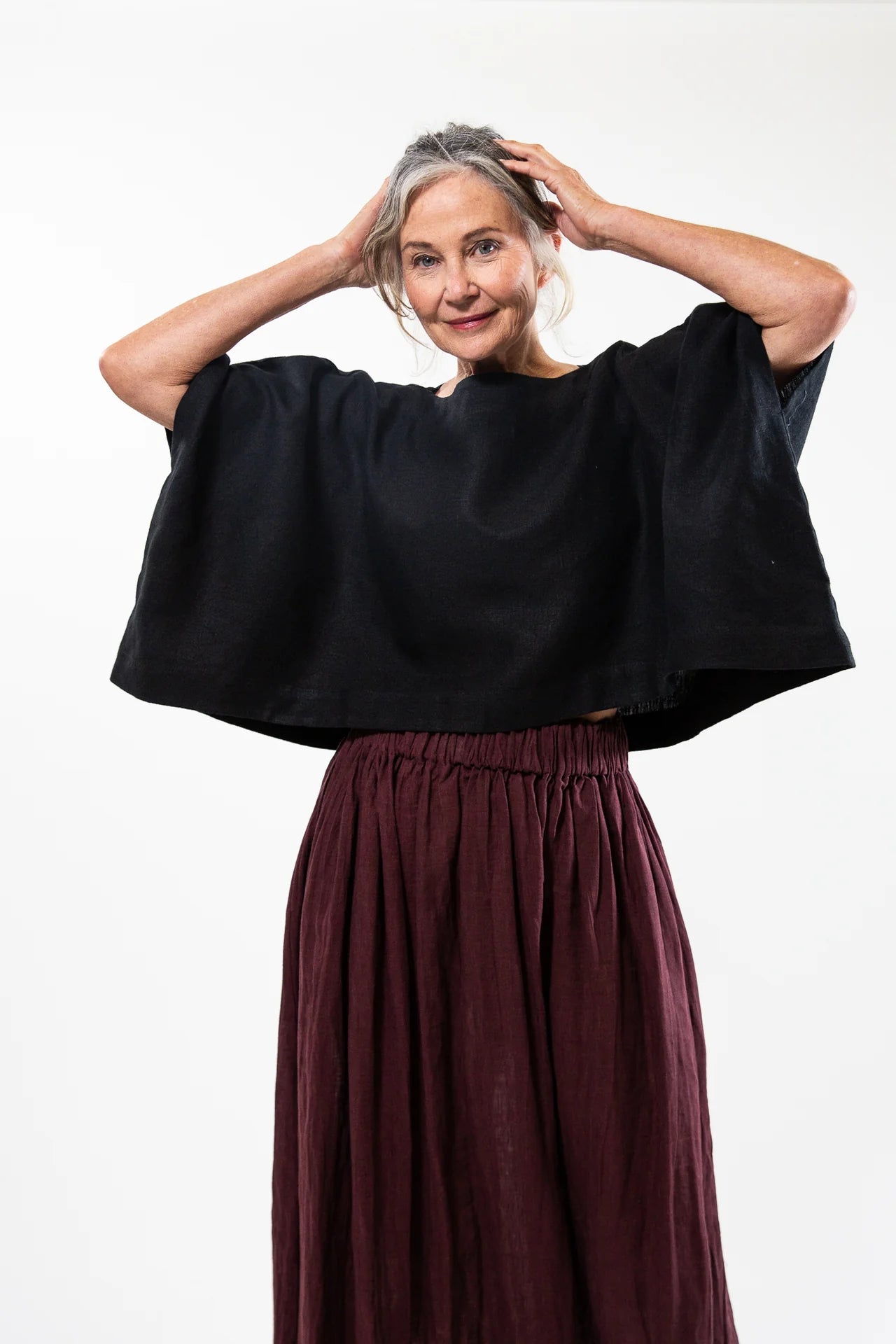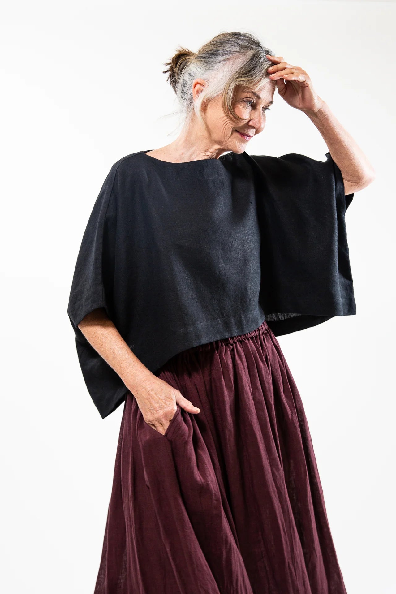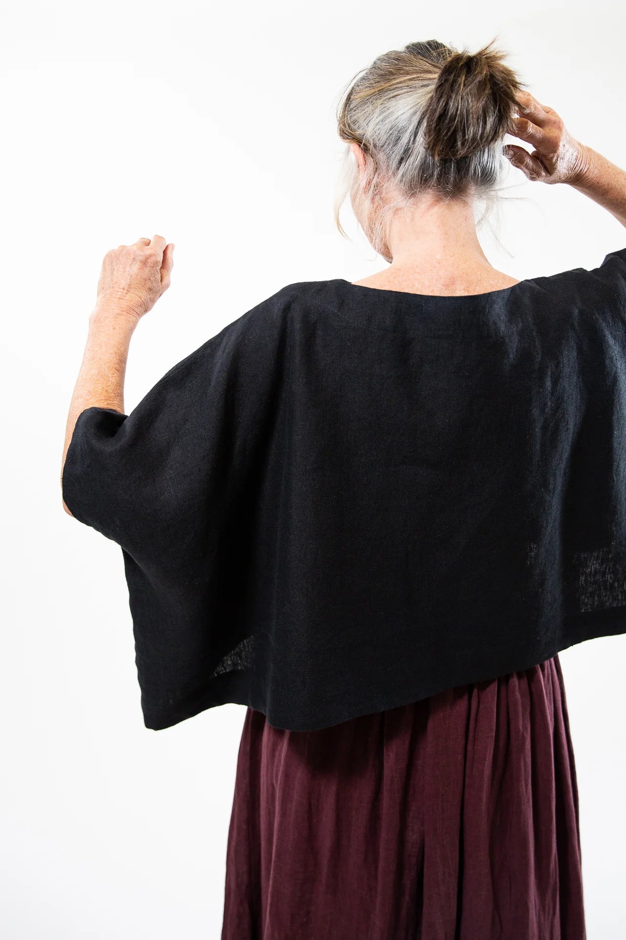 The Tommy Top is a versatile cropped-length layering garment. It has an elegant boat neckline, dropped shoulders which become the sleeves and a wide boxy shape through the body. The front hemline is shaped and all edges of this garment feature a lovely wide facing adding to the quality feel of this garment.