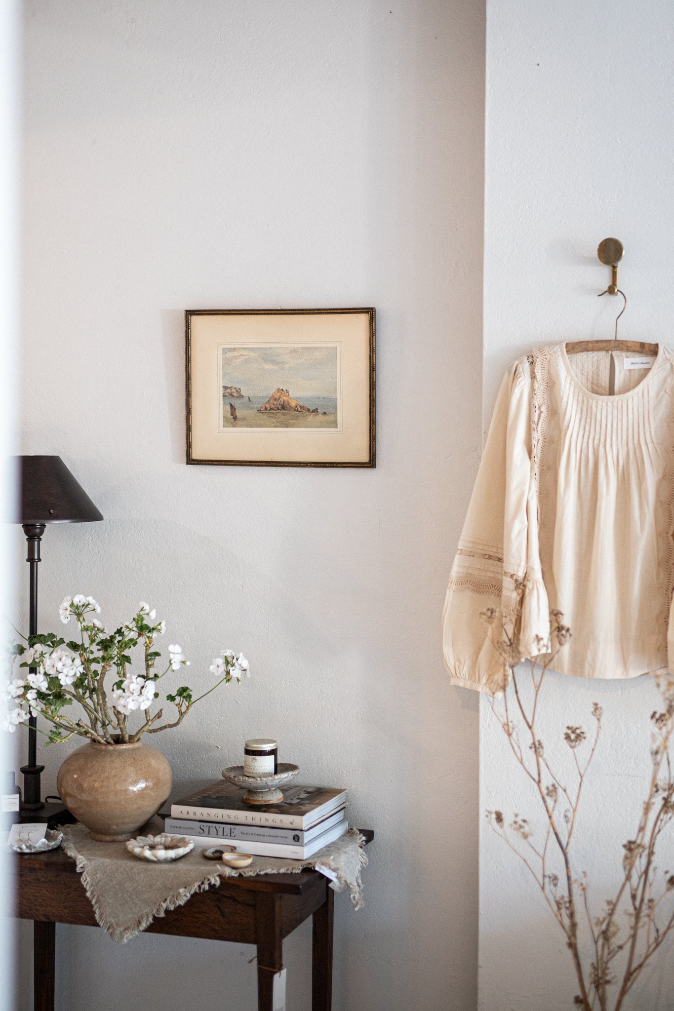 An original vintage framed watercolour painting under glass. Very charming, a reminder of adventures by the sea. Lovely for an art wall or paired with another artwork. Some aging to the matte board that surrounds this gorgeous piece is visible which simply adds to the character of this piece.